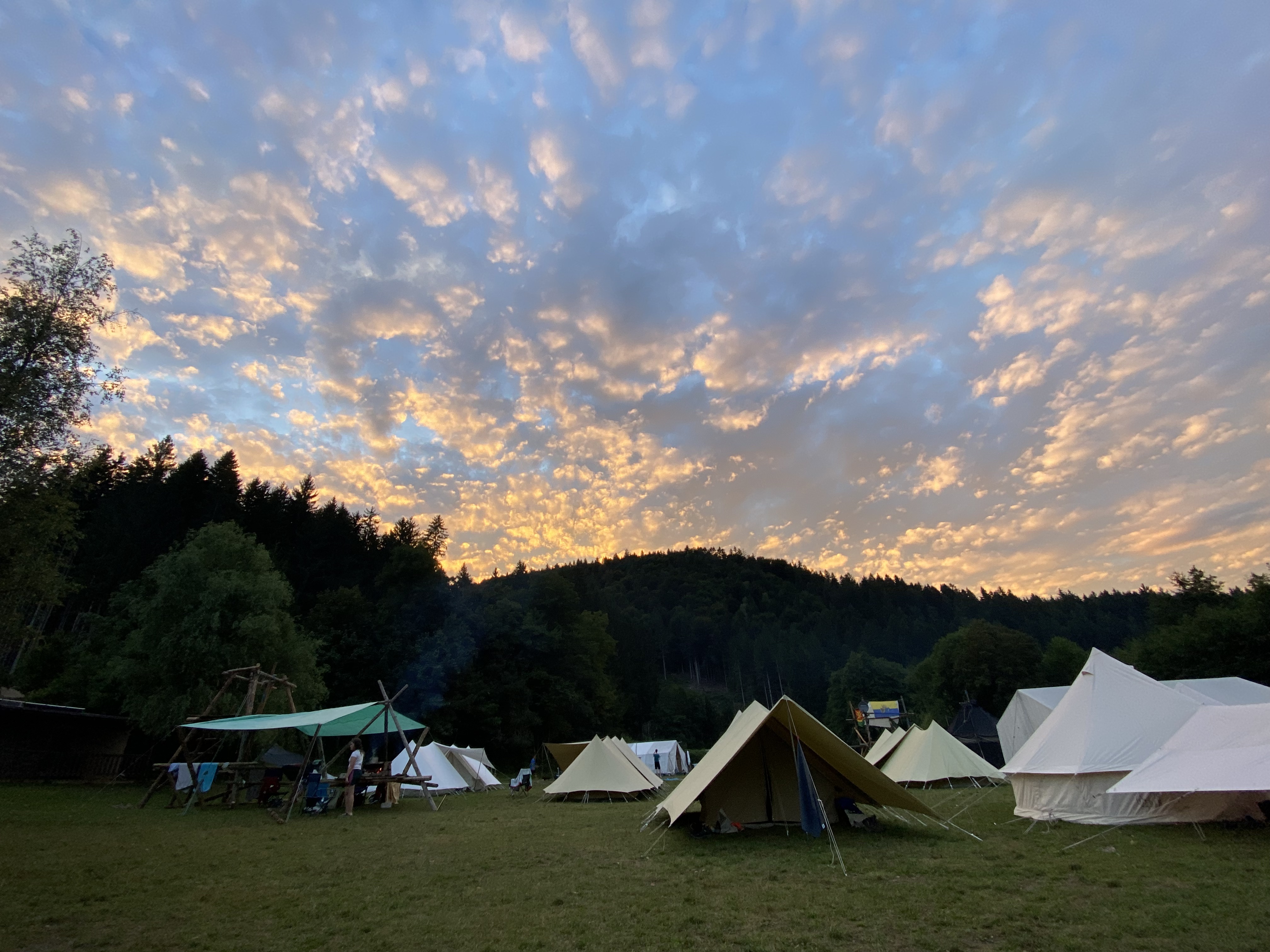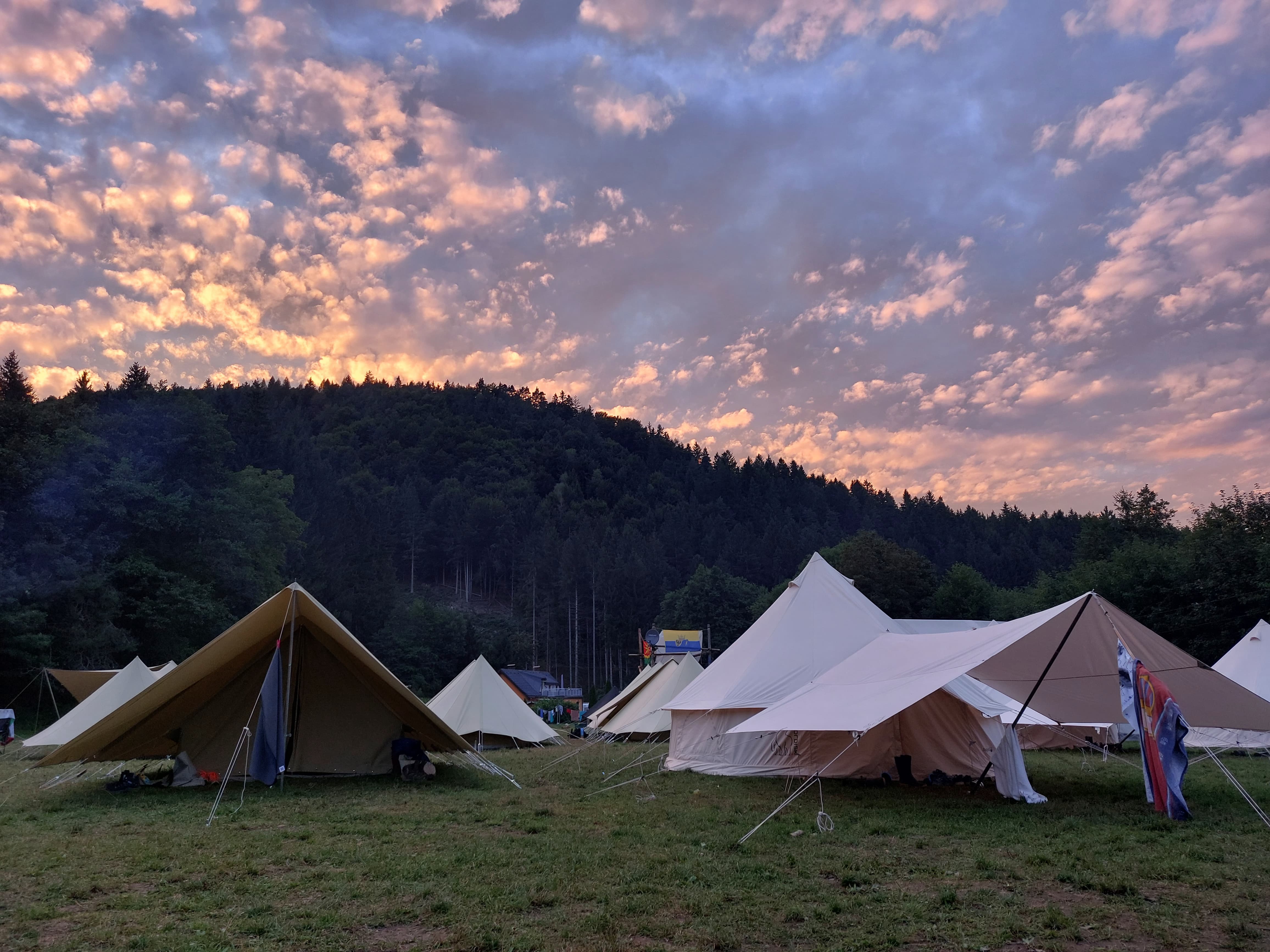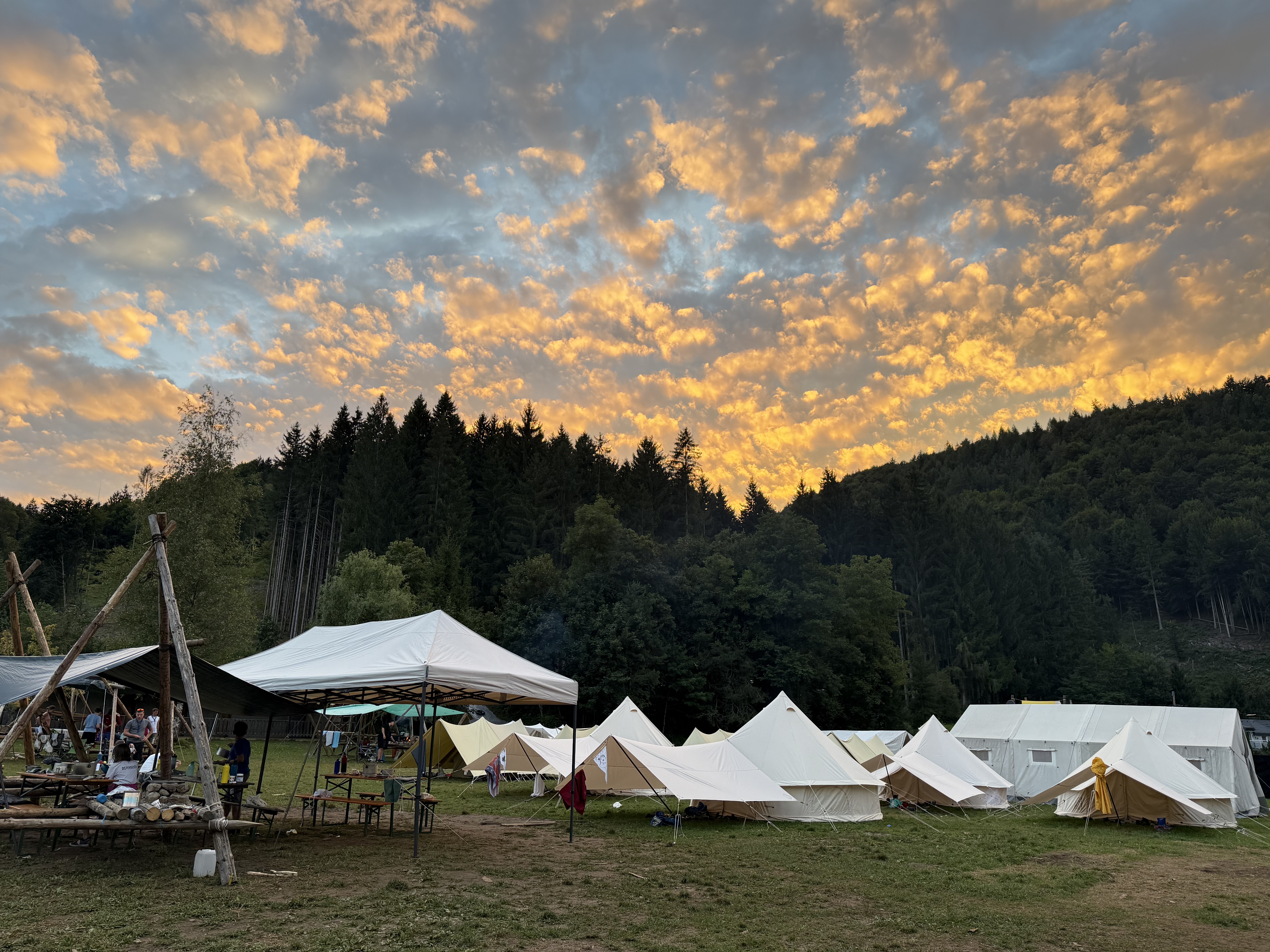 Nach einer langen Anfahrt kamen wir leider voll in den Regen. Aber dank guter Zusammenarbeit haben wir es trotzdem geschafft, heute alle Zelte aufzubauen, sodass jede*r im Trockenen schlafen kann! Insgesamt zwar ein nasser, aber erfolgreicher Start ins Lager.