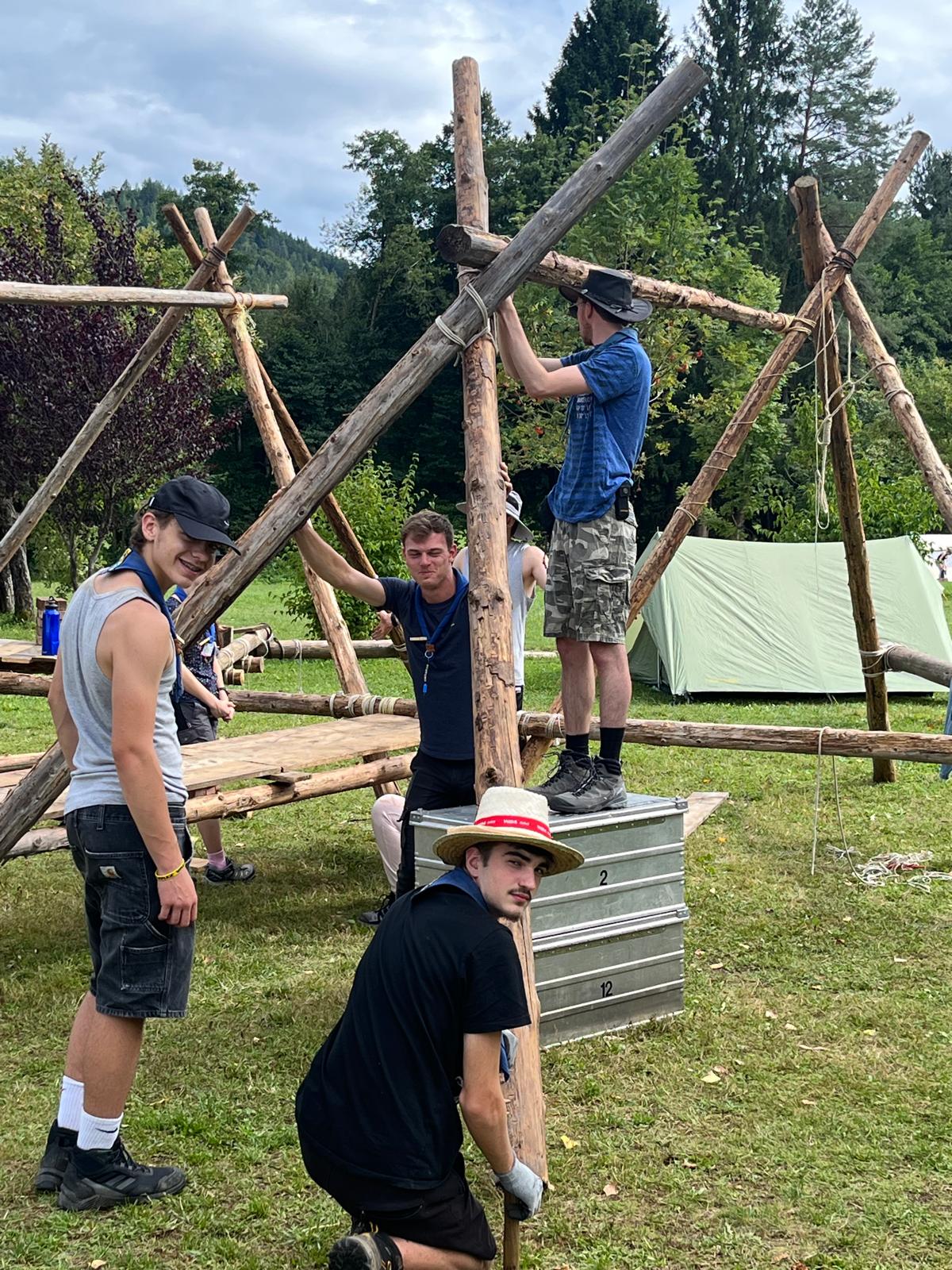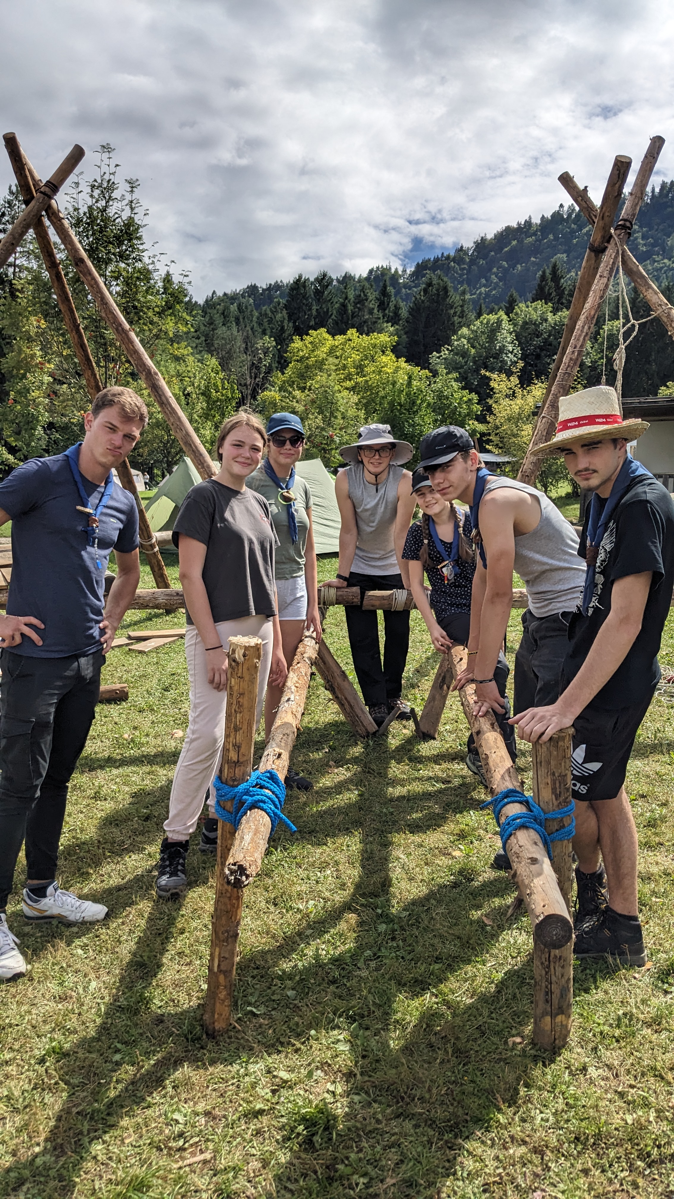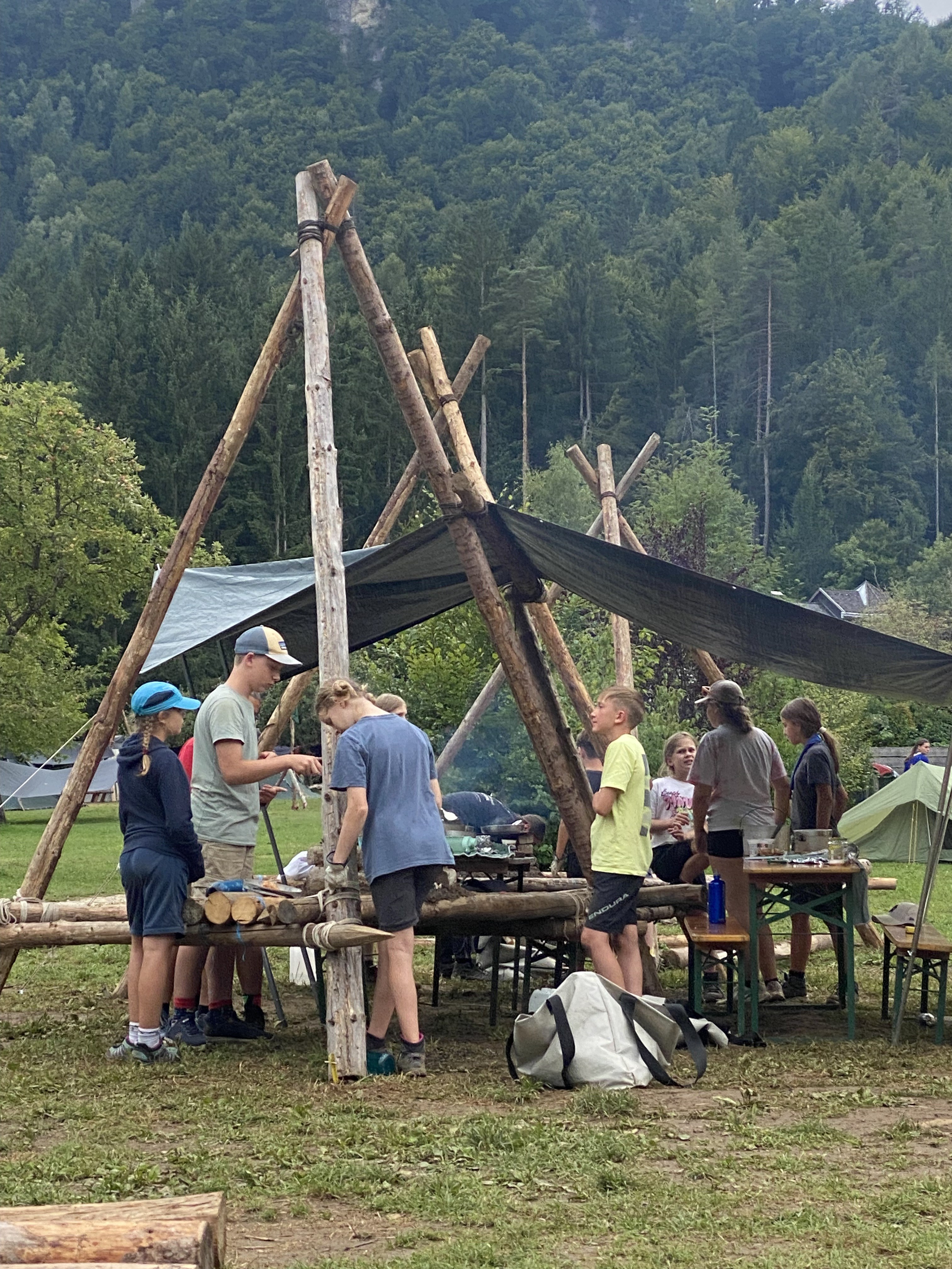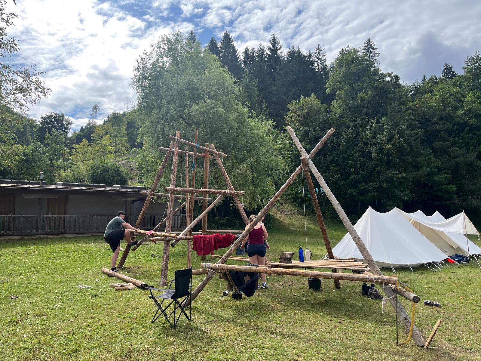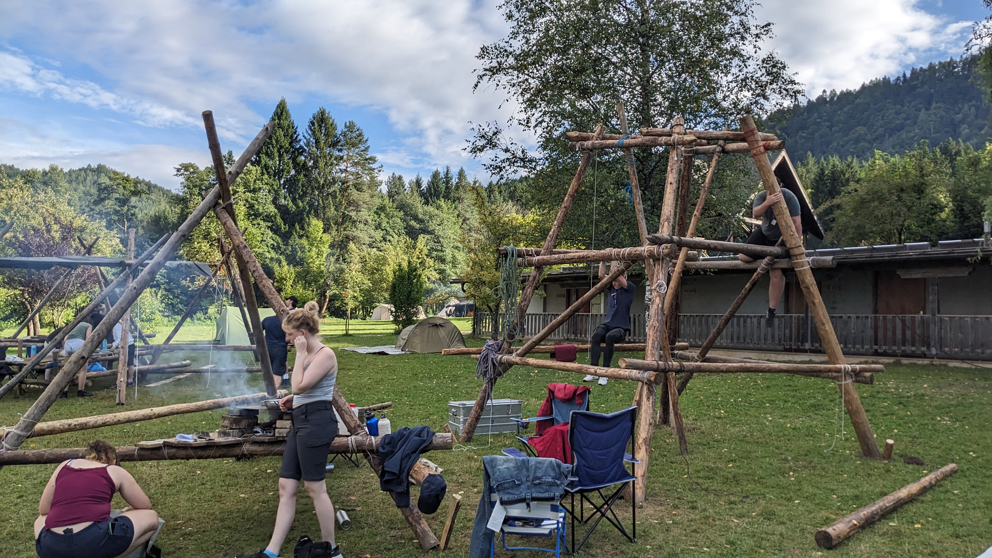Tja, die Fotos von Montag sind leider erst heute Dienstag in Wien zum Hochladen angekommen – tut mir leid. Umso schöner sind die Bilder! Während die Guides und Späher ihre Doppel-Kochstelle fertiggestellt haben, haben die Caravelles und Explorer sich im Spiel Taskmaster versucht – leider (oder zum Glück?) ohne Beisein des britischen Fernsehens. Ich hoffe, euch die detaillierten Aufgabenbeschreibungen der CaEx nachreichen zu können.