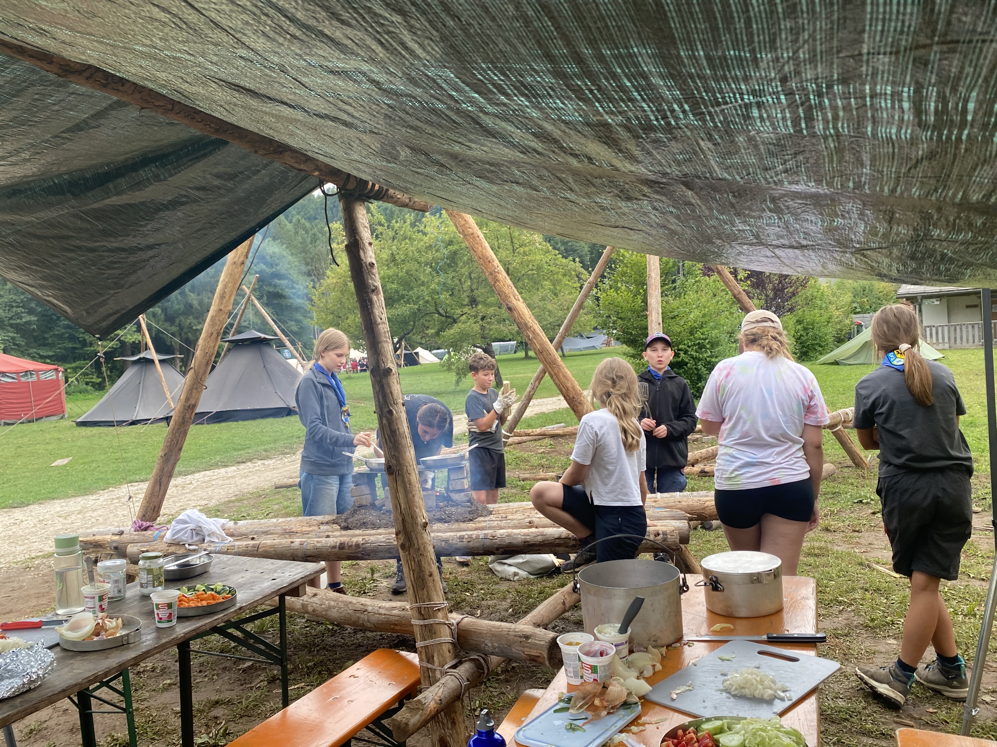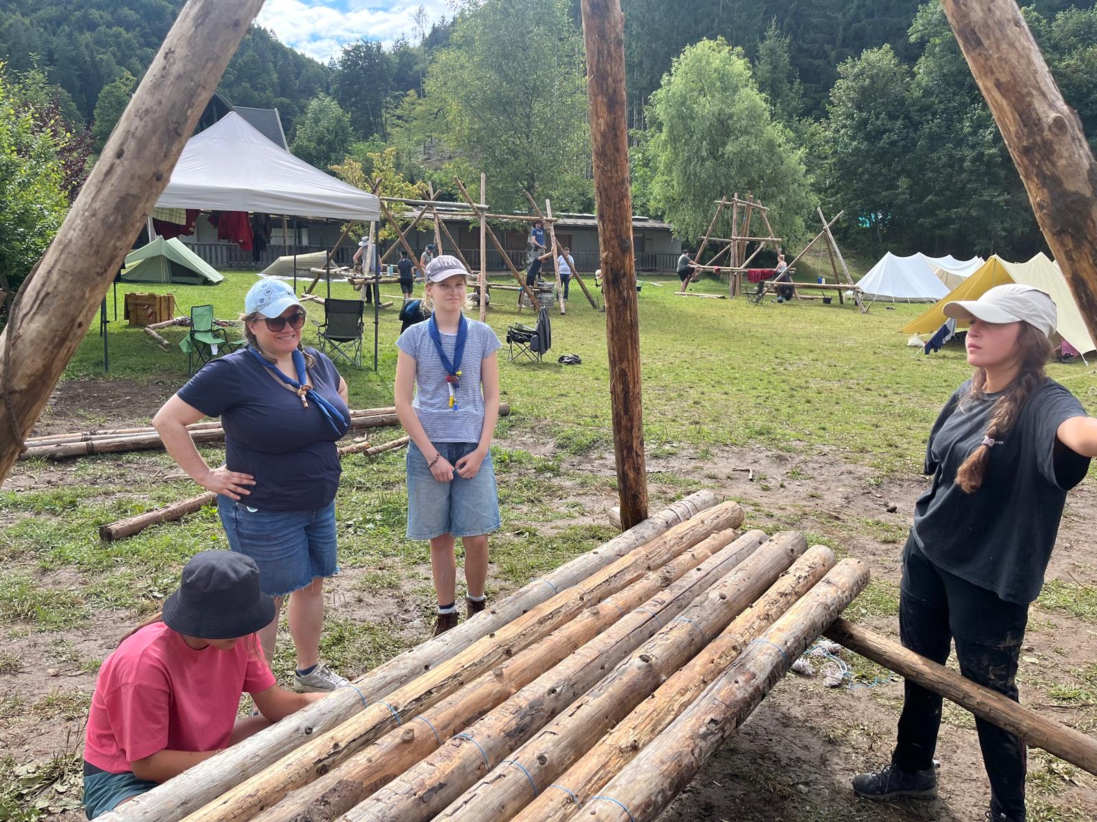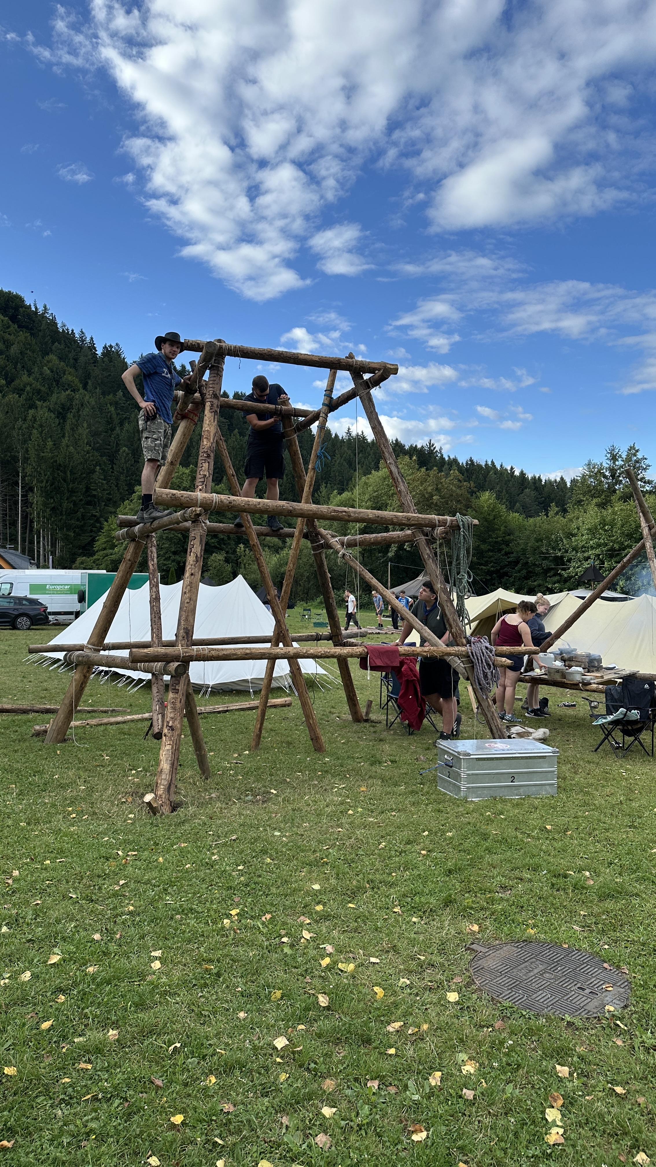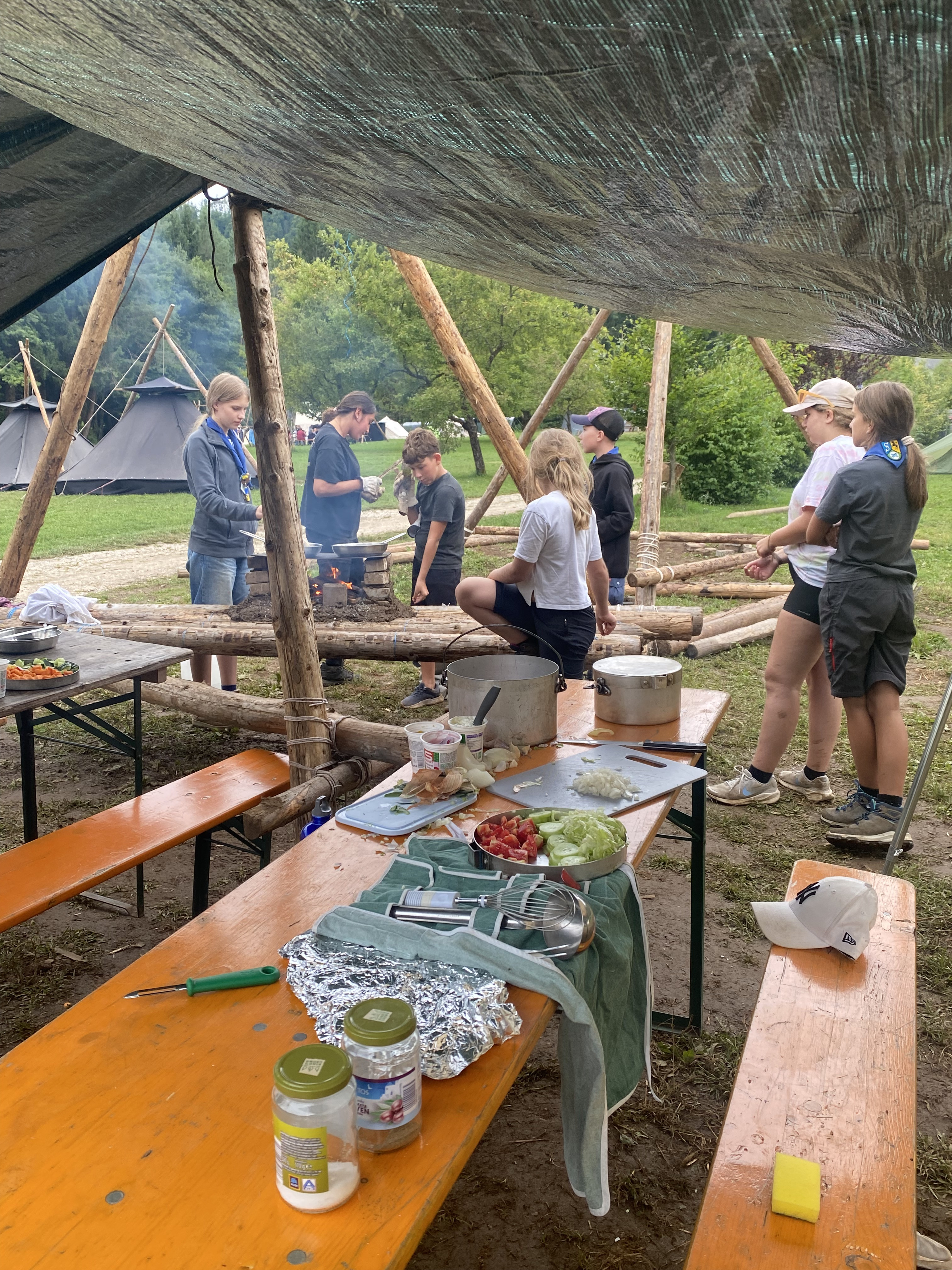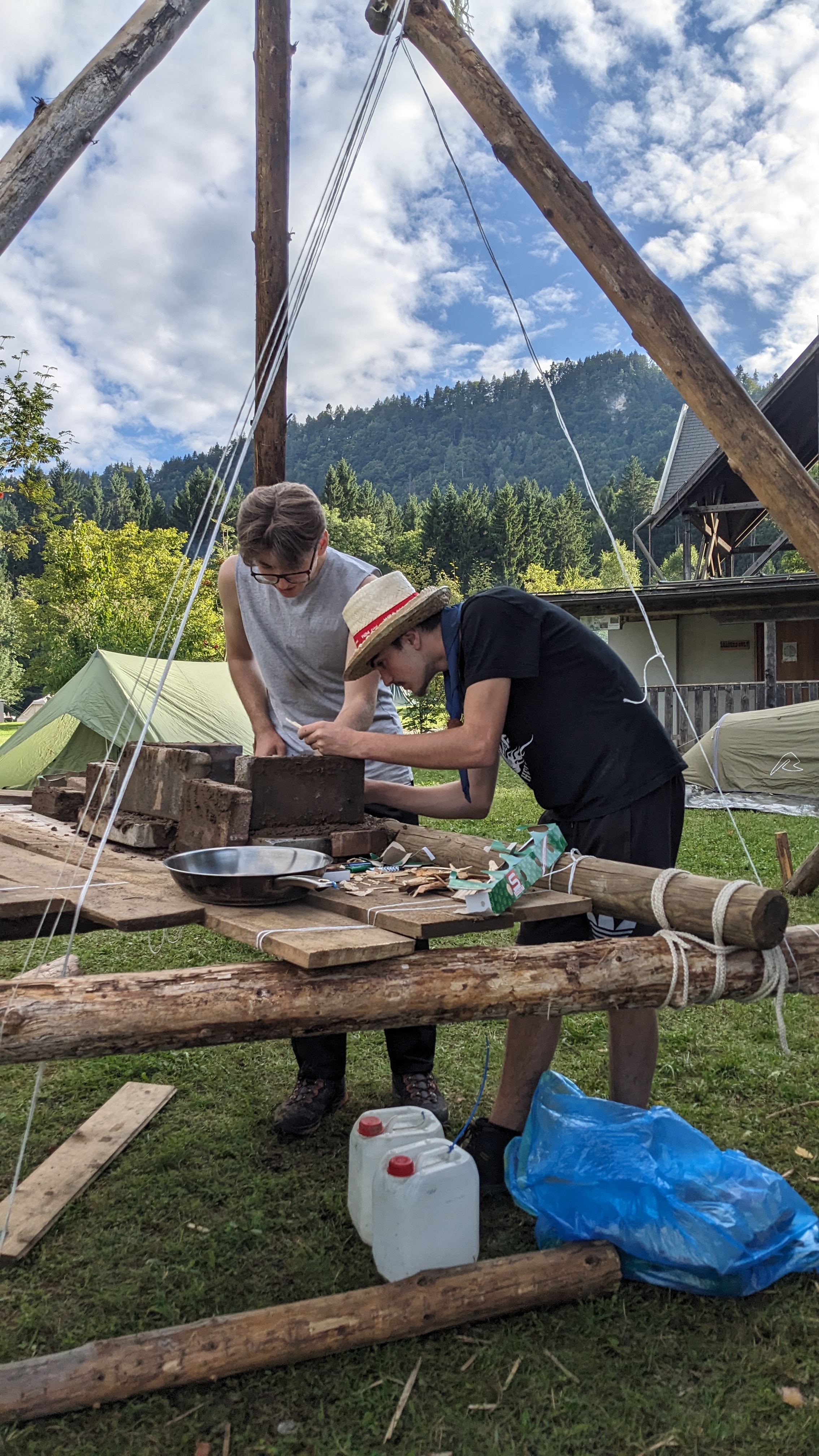 Tja, die Fotos von Montag sind leider erst heute Dienstag in Wien zum Hochladen angekommen – tut mir leid. Umso schöner sind die Bilder! Während die Guides und Späher ihre Doppel-Kochstelle fertiggestellt haben, haben die Caravelles und Explorer sich im Spiel Taskmaster versucht – leider (oder zum Glück?) ohne Beisein des britischen Fernsehens. Ich hoffe, euch die detaillierten Aufgabenbeschreibungen der CaEx nachreichen zu können.