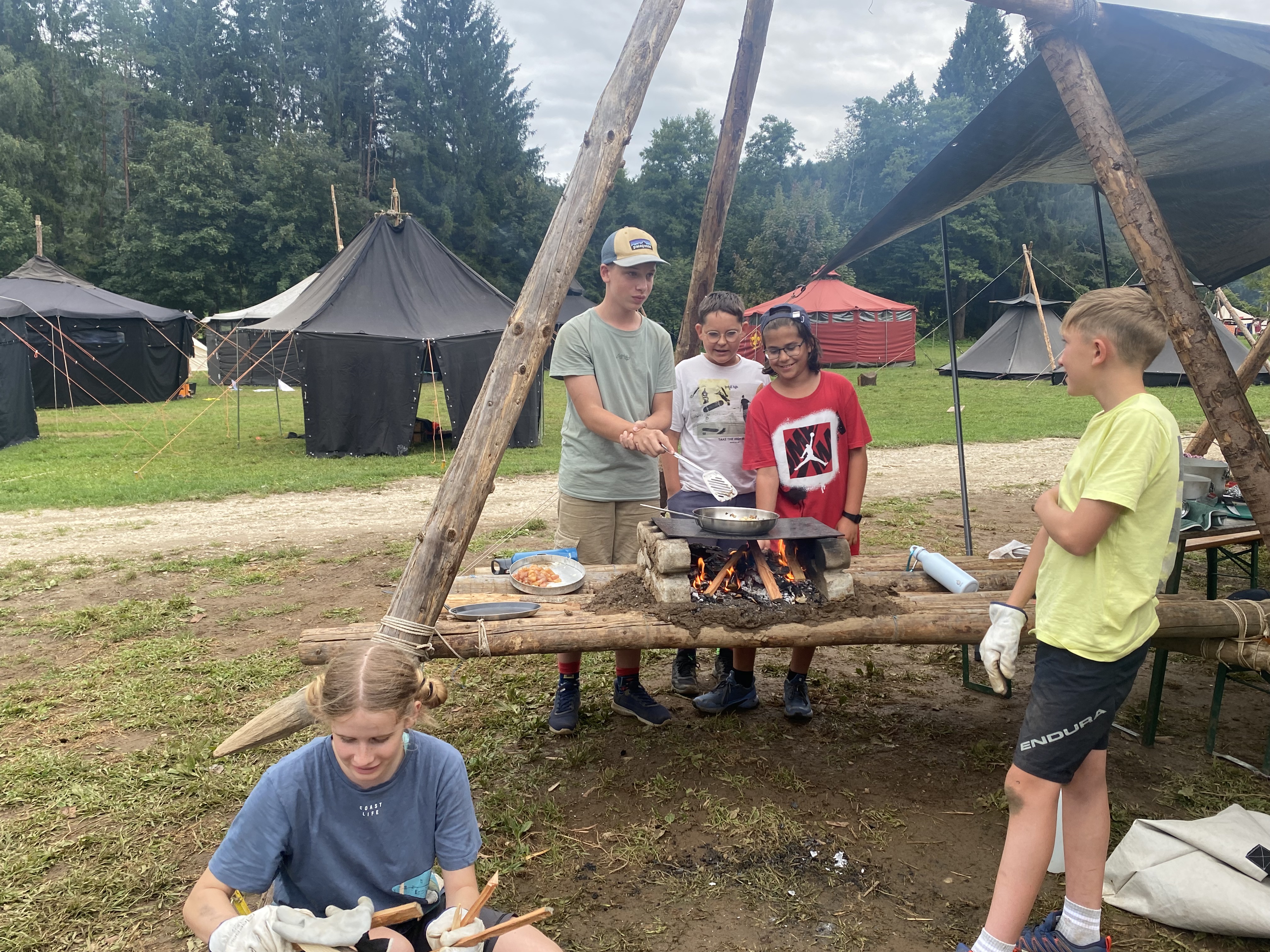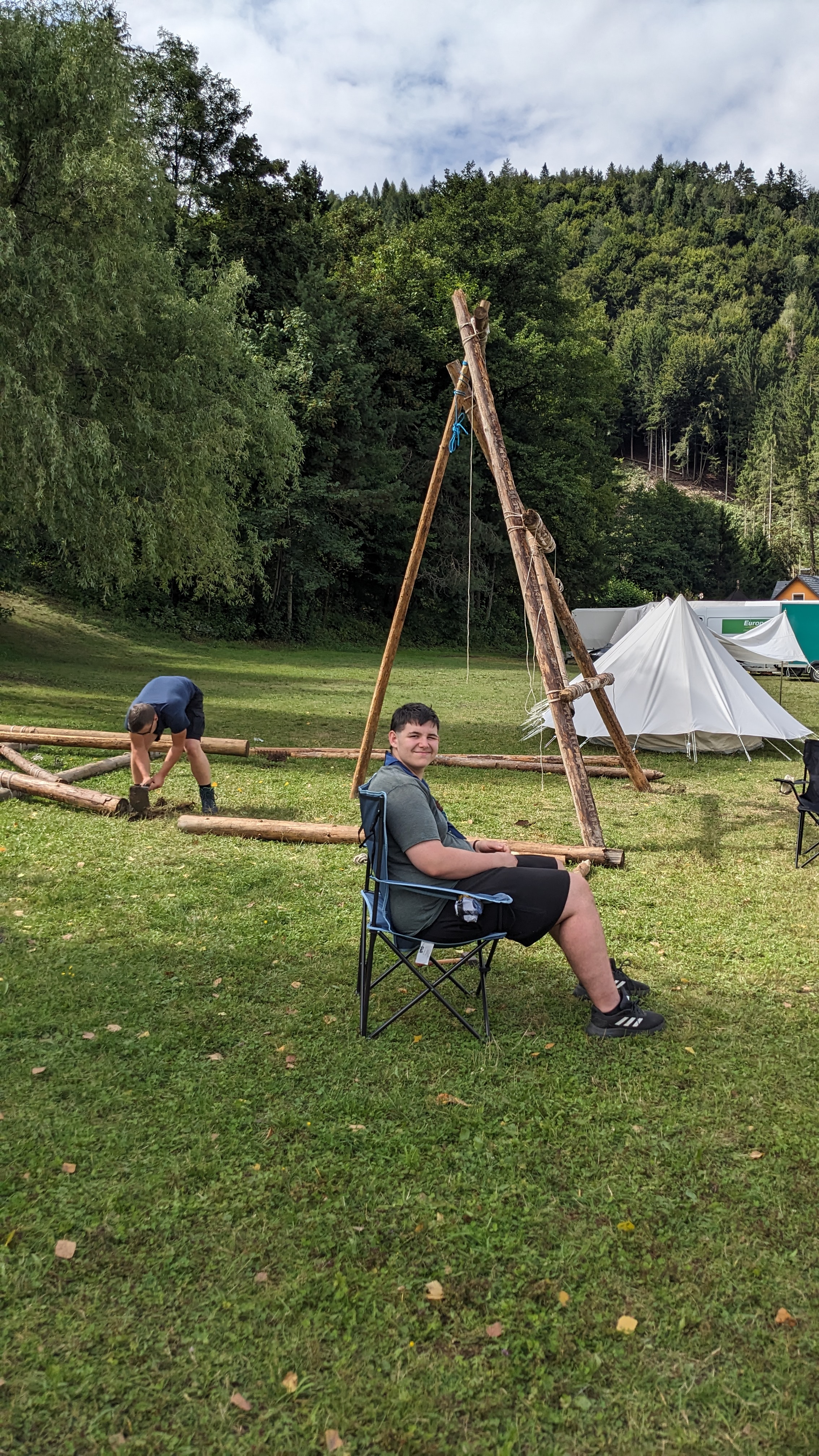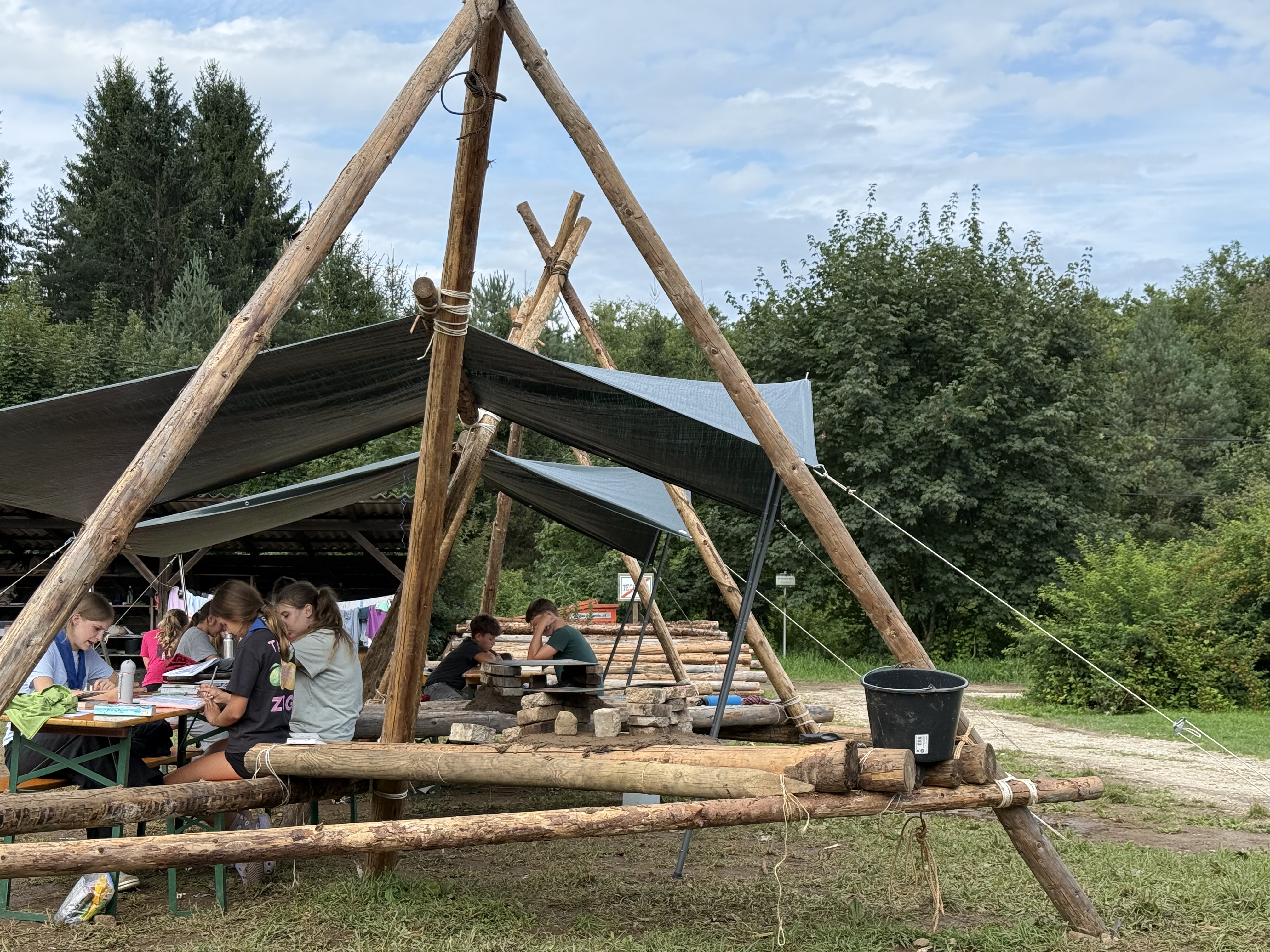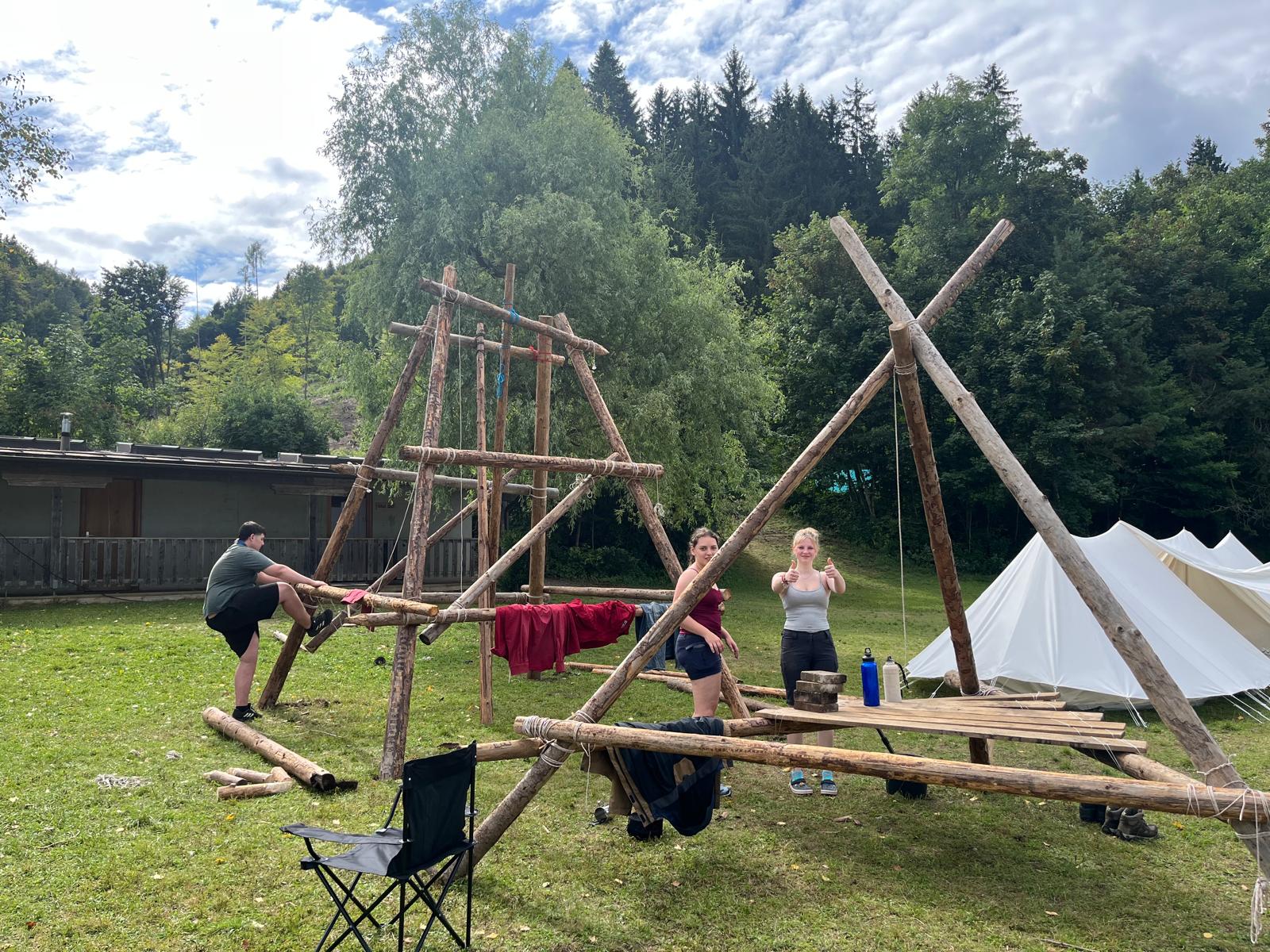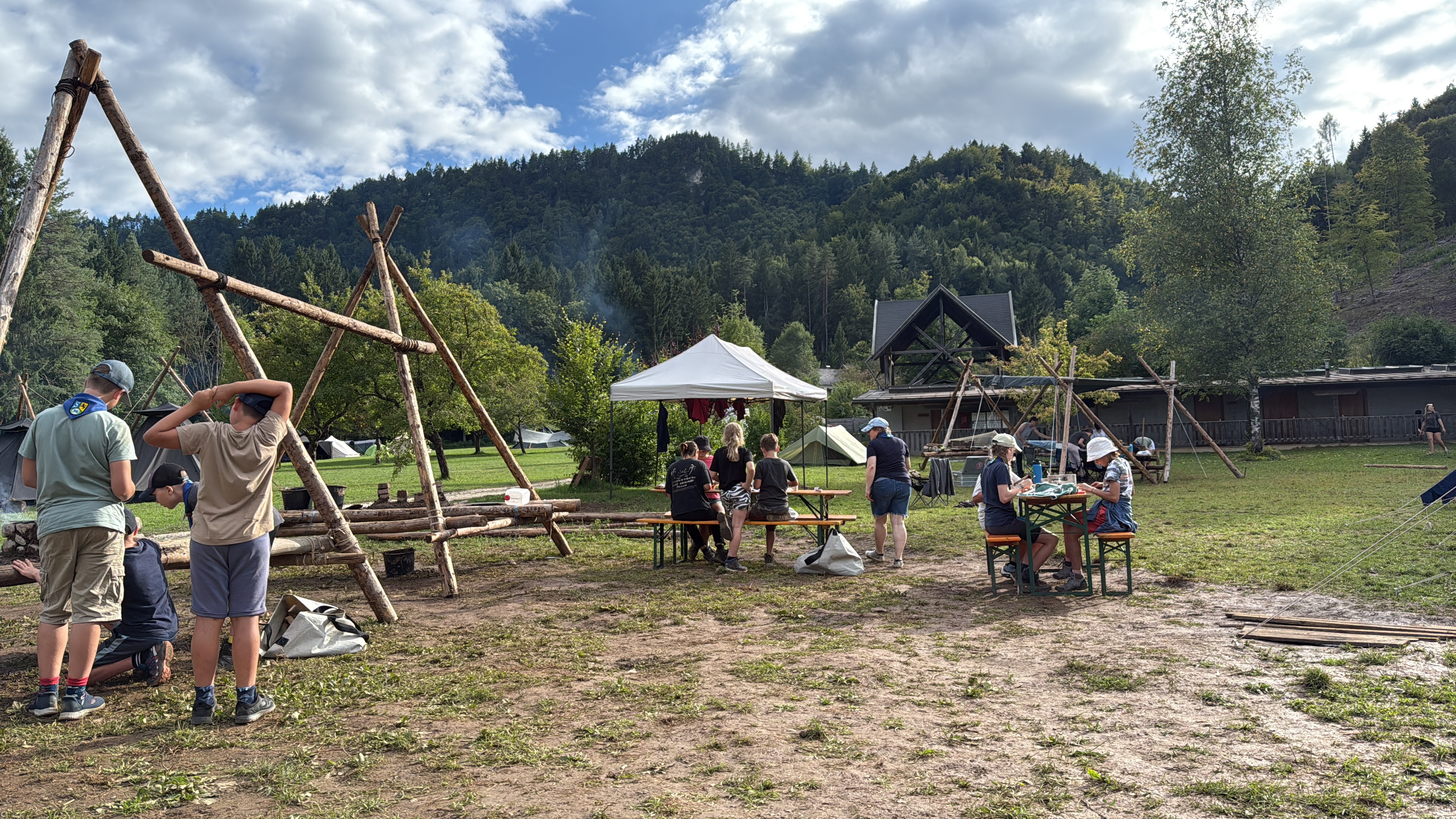 Tja, die Fotos von Montag sind leider erst heute Dienstag in Wien zum Hochladen angekommen – tut mir leid. Umso schöner sind die Bilder! Während die Guides und Späher ihre Doppel-Kochstelle fertiggestellt haben, haben die Caravelles und Explorer sich im Spiel Taskmaster versucht – leider (oder zum Glück?) ohne Beisein des britischen Fernsehens. Ich hoffe, euch die detaillierten Aufgabenbeschreibungen der CaEx nachreichen zu können.