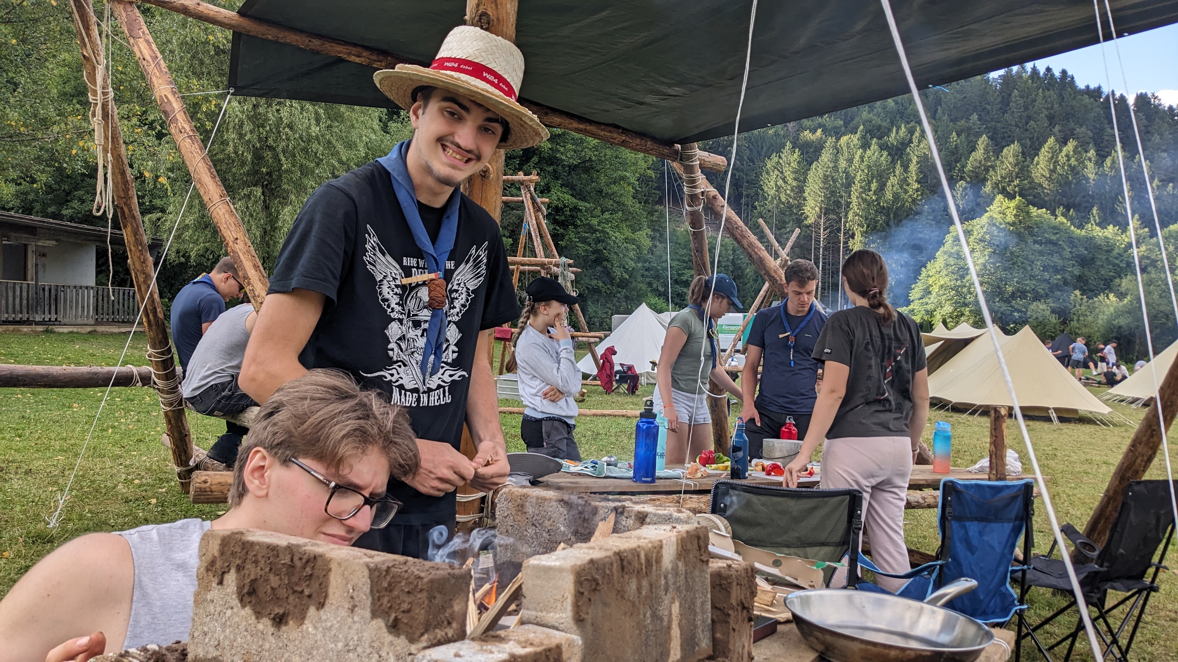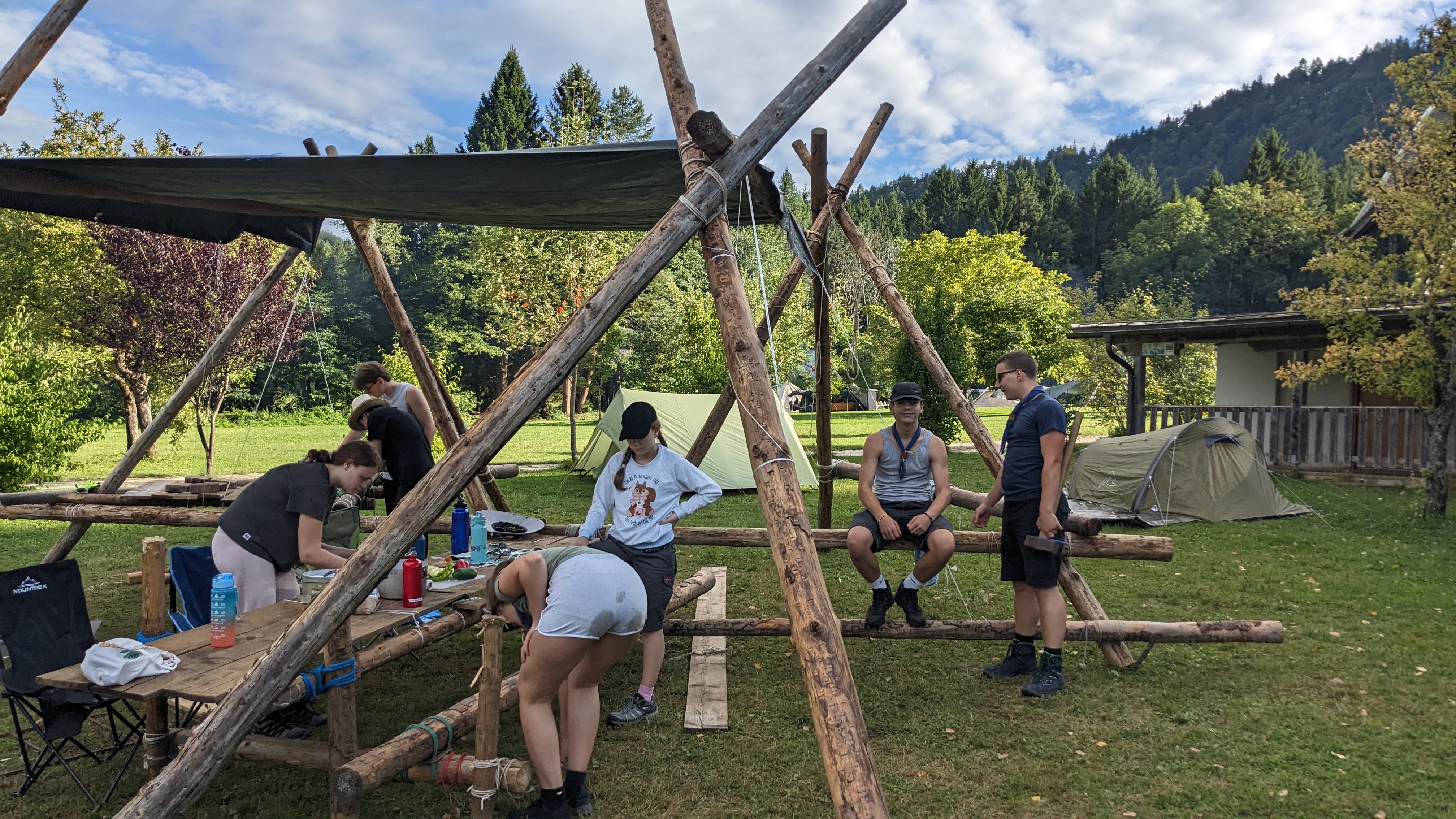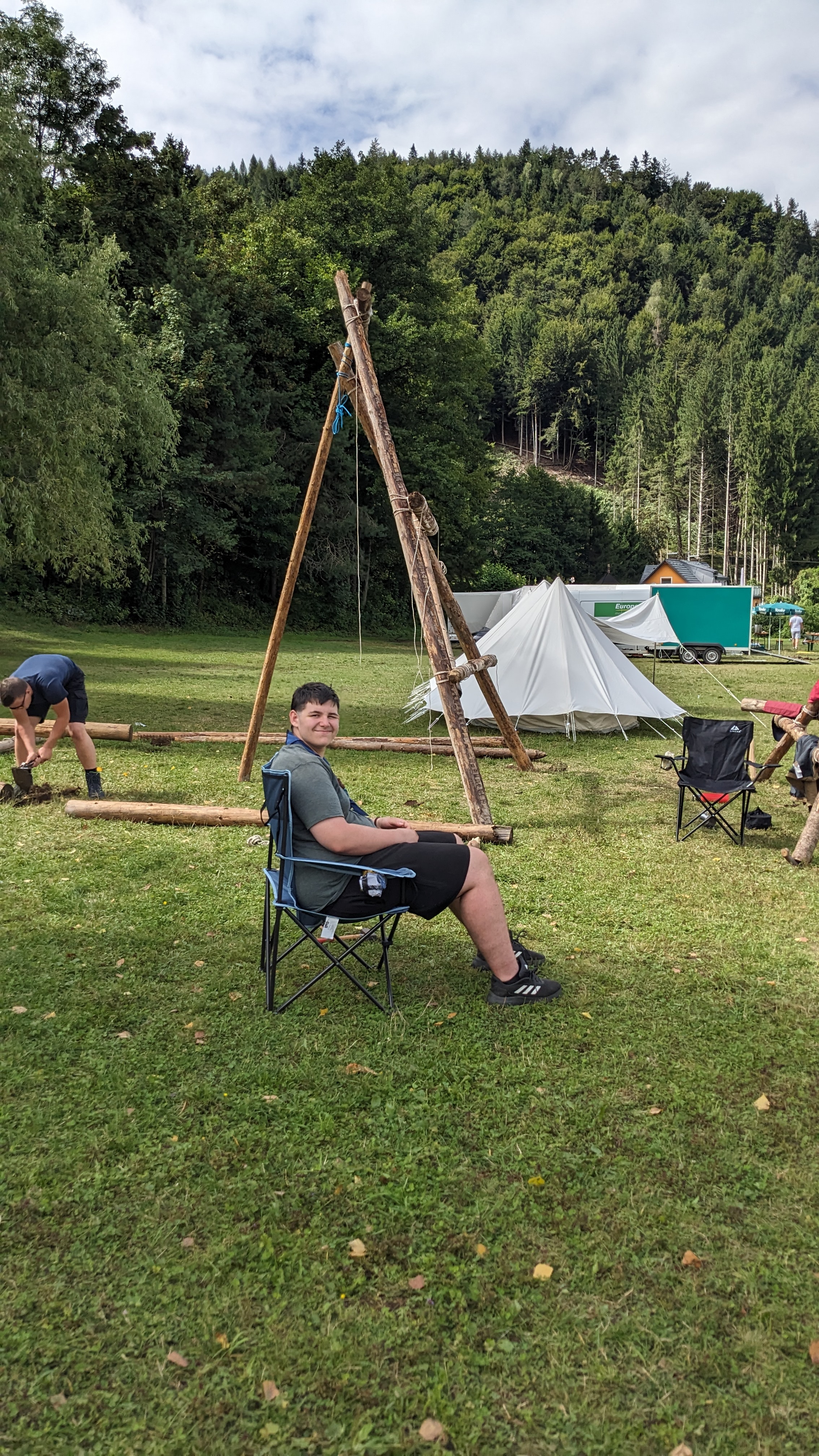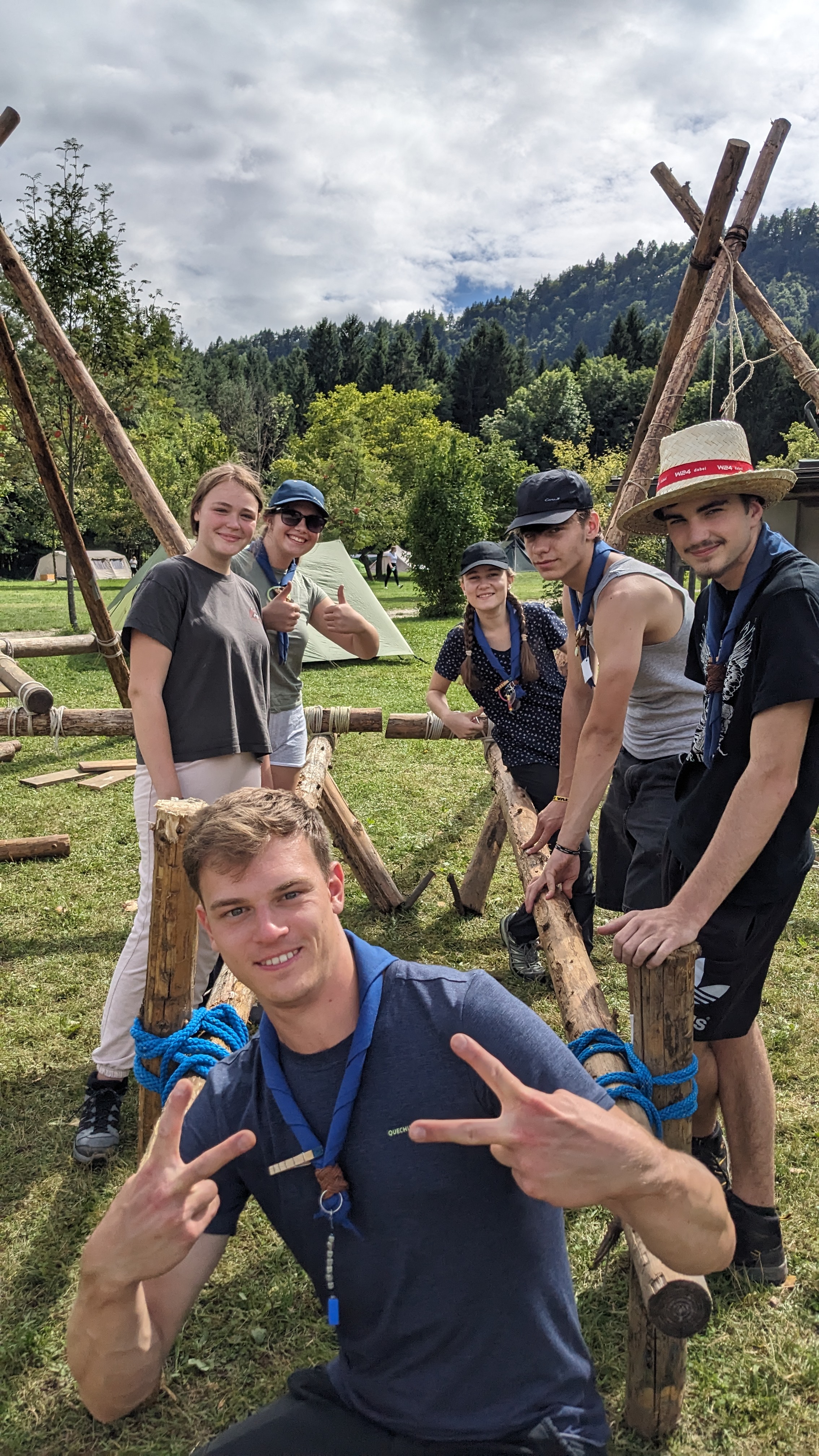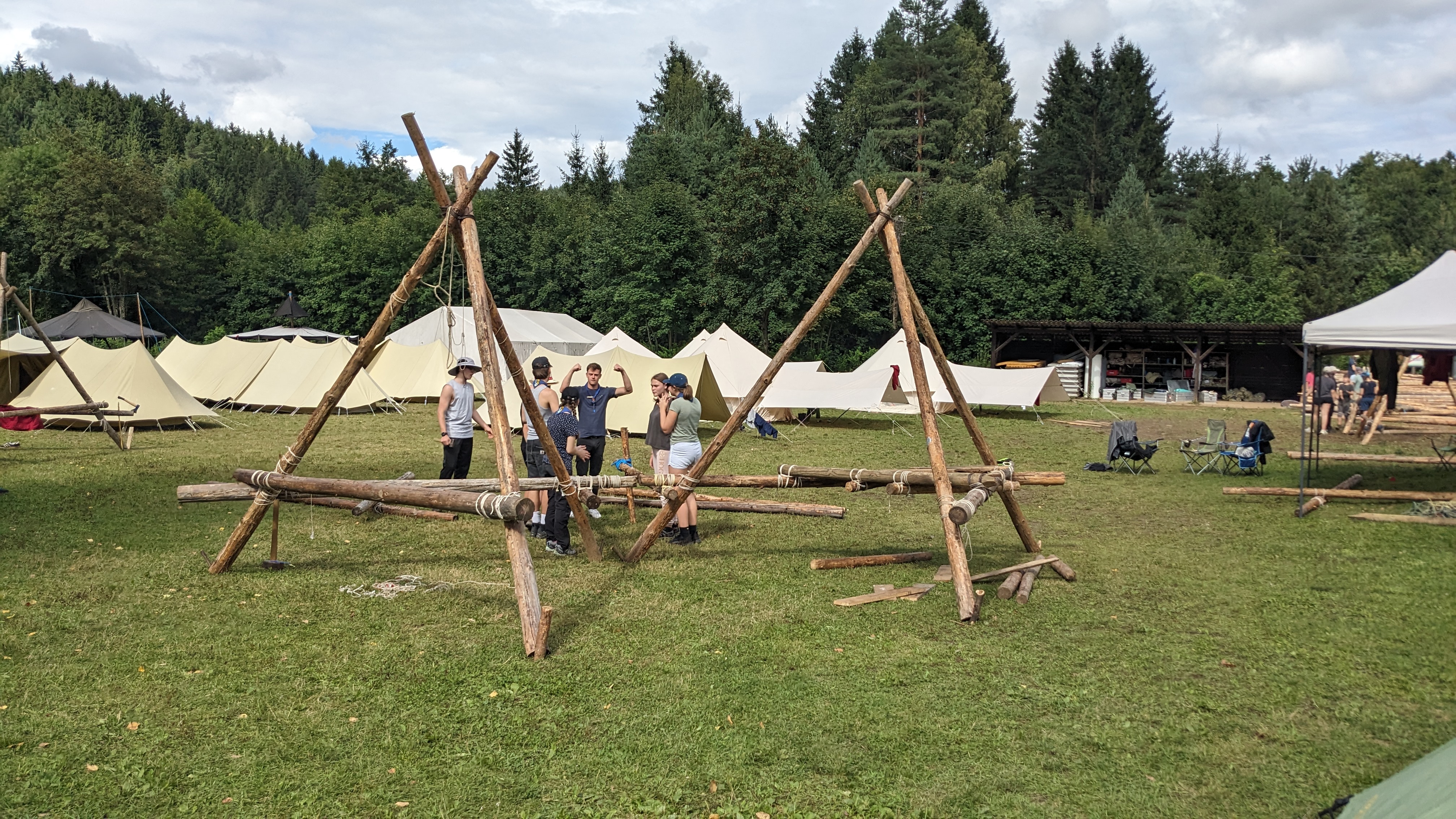 Tja, die Fotos von Montag sind leider erst heute Dienstag in Wien zum Hochladen angekommen – tut mir leid. Umso schöner sind die Bilder! Während die Guides und Späher ihre Doppel-Kochstelle fertiggestellt haben, haben die Caravelles und Explorer sich im Spiel Taskmaster versucht – leider (oder zum Glück?) ohne Beisein des britischen Fernsehens. Ich hoffe, euch die detaillierten Aufgabenbeschreibungen der CaEx nachreichen zu können.