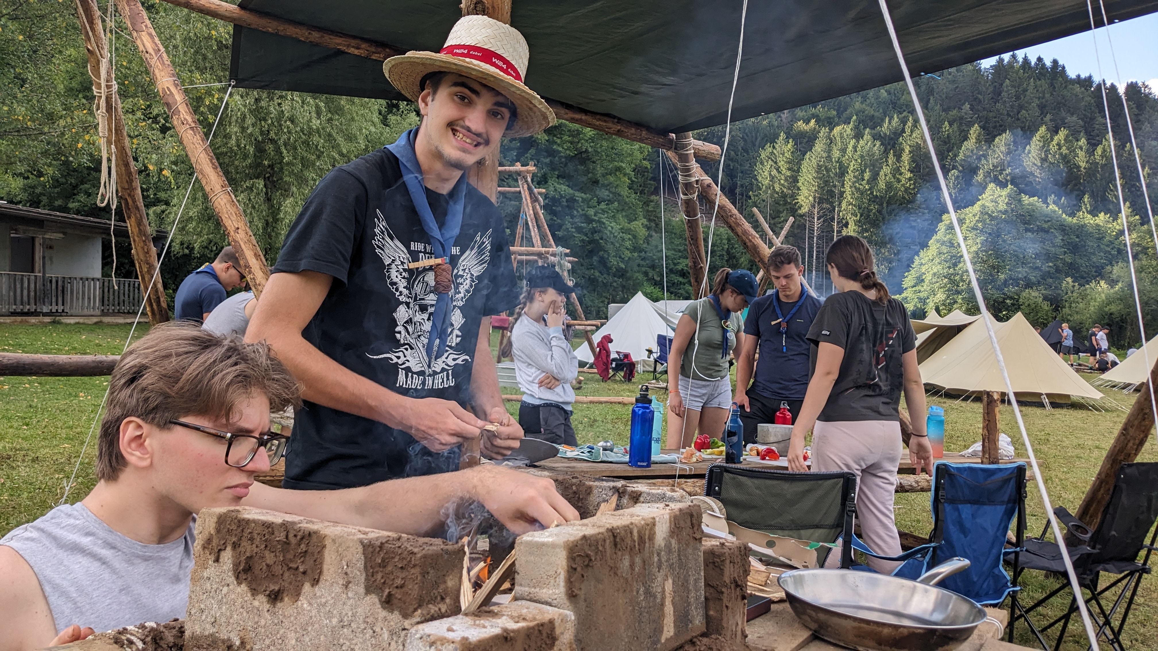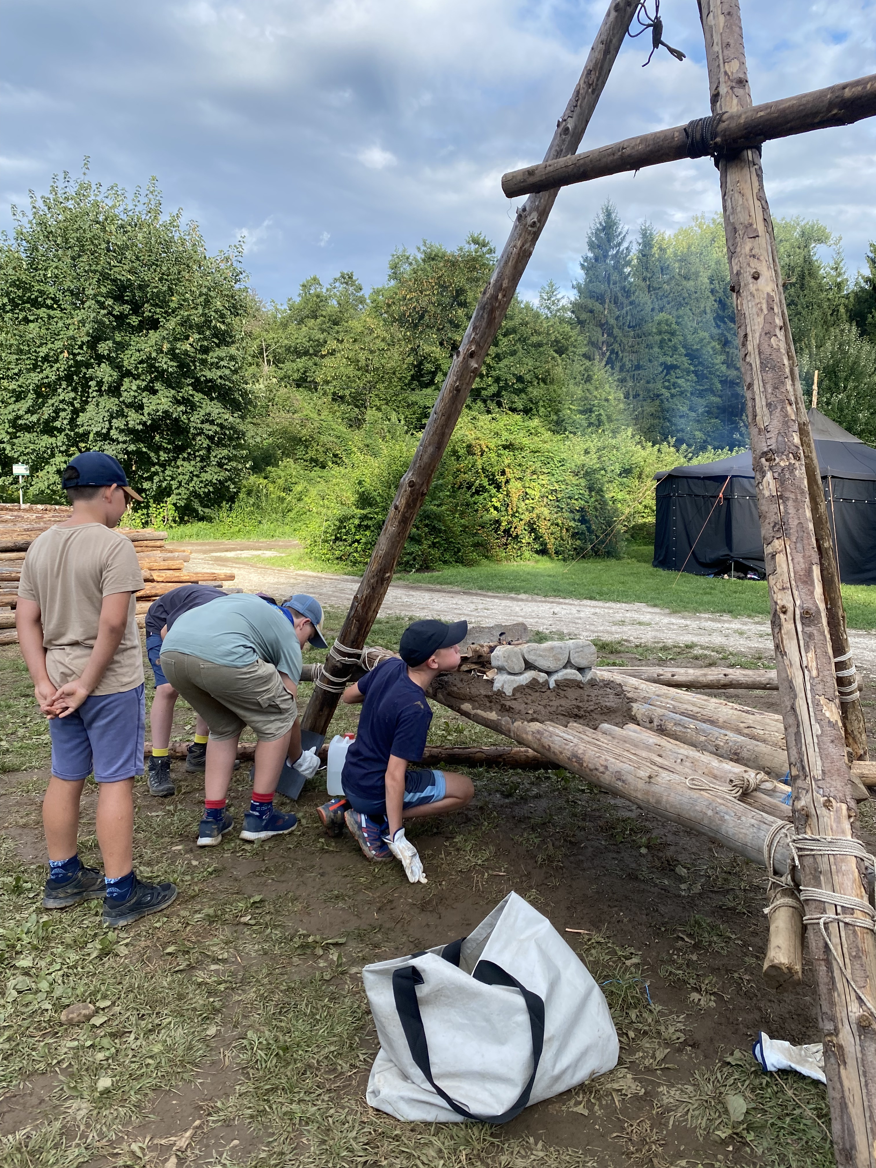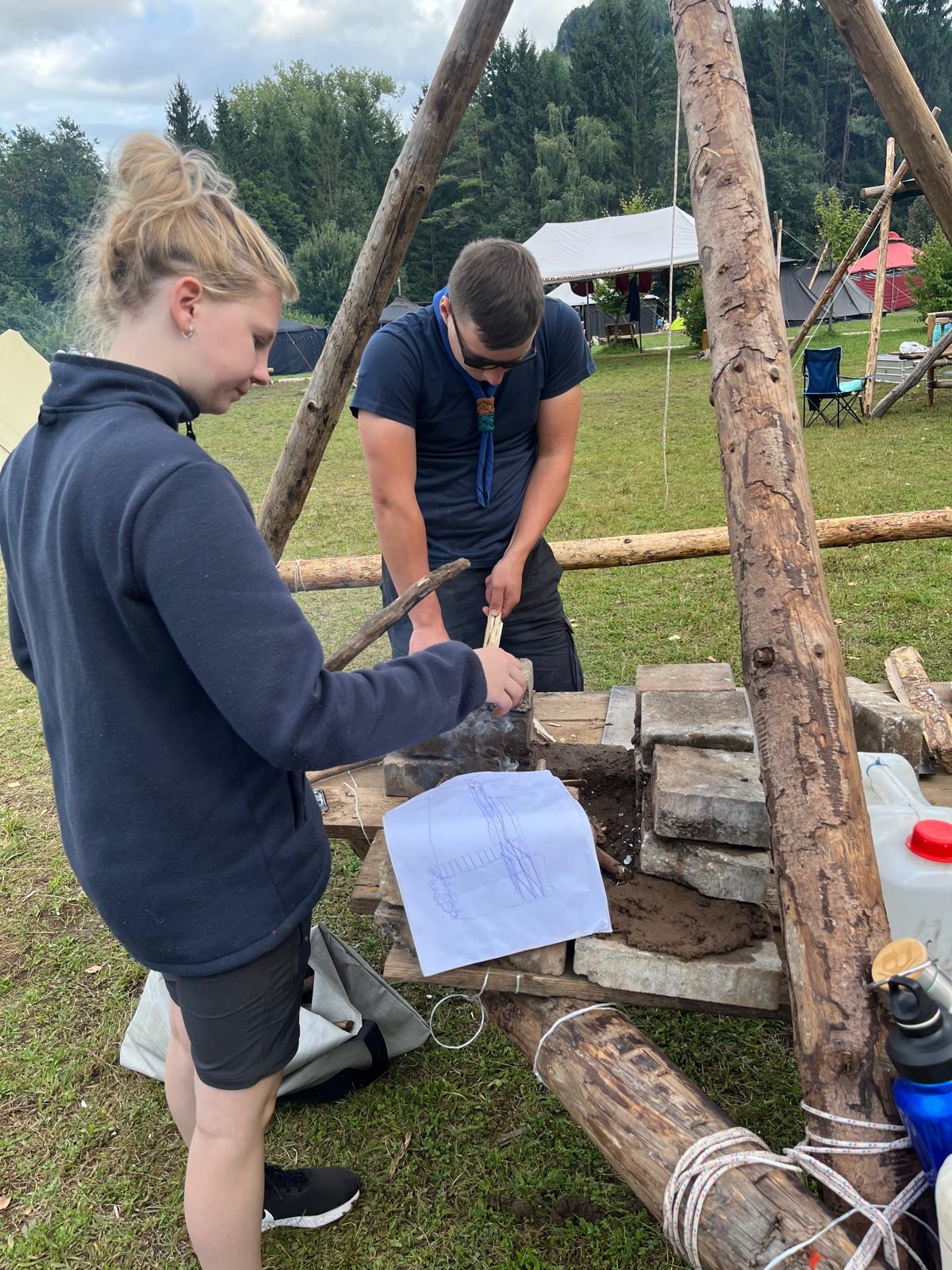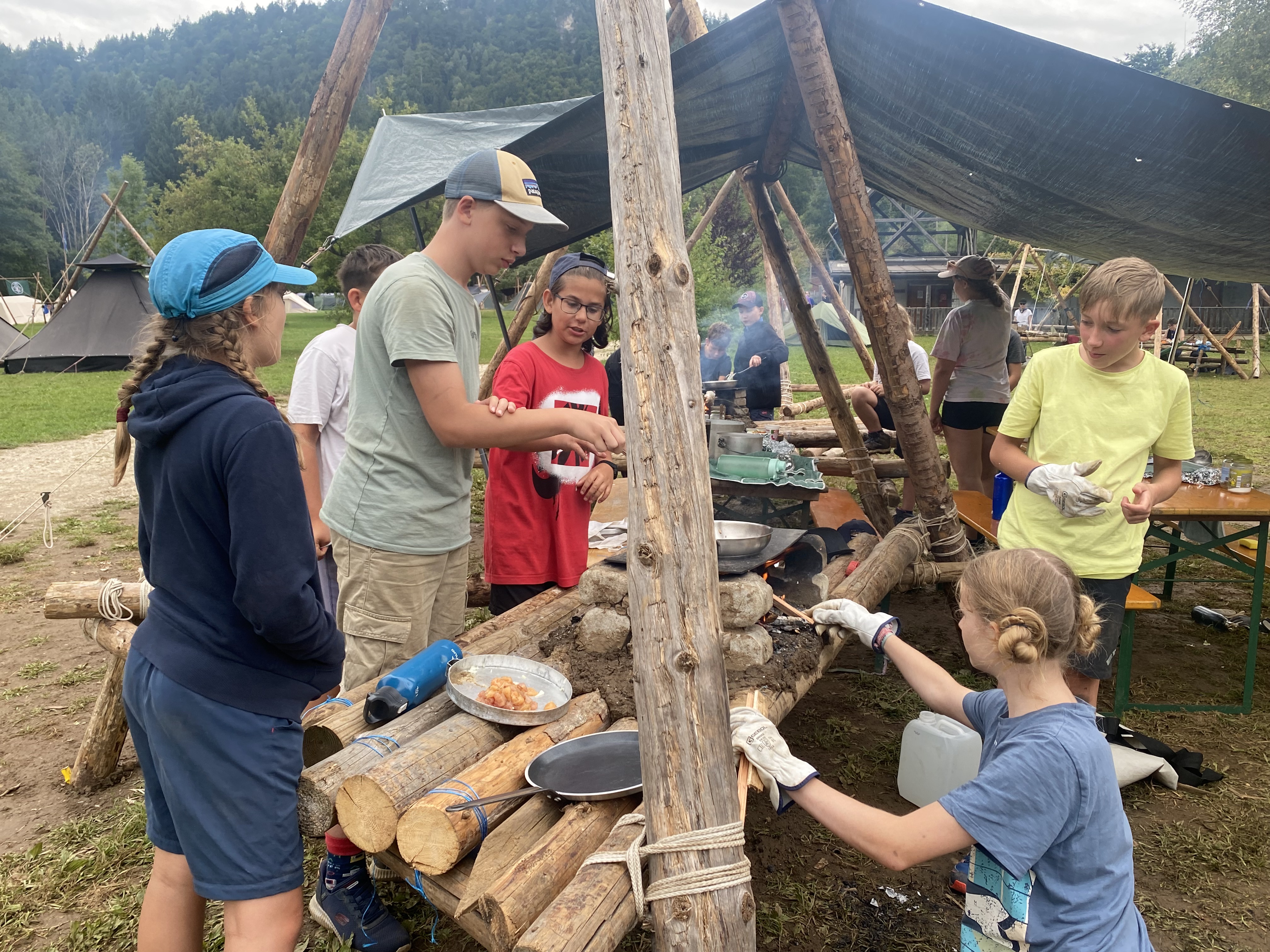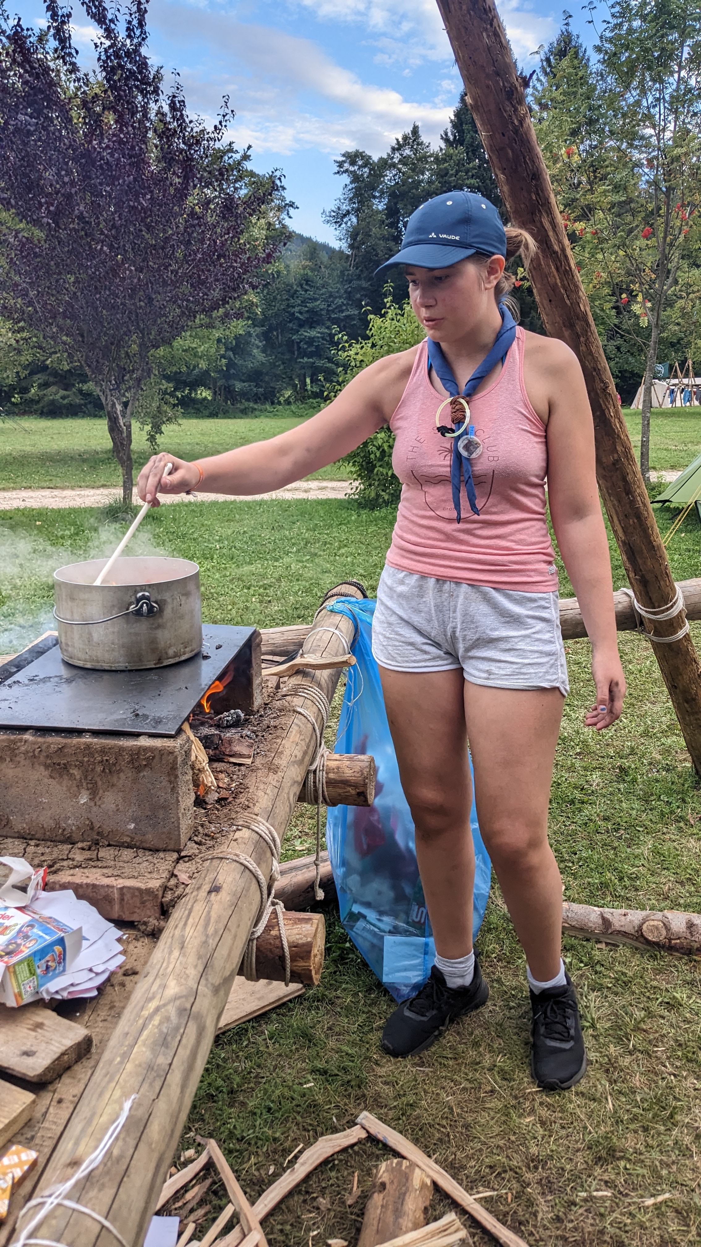 Tja, die Fotos von Montag sind leider erst heute Dienstag in Wien zum Hochladen angekommen – tut mir leid. Umso schöner sind die Bilder! Während die Guides und Späher ihre Doppel-Kochstelle fertiggestellt haben, haben die Caravelles und Explorer sich im Spiel Taskmaster versucht – leider (oder zum Glück?) ohne Beisein des britischen Fernsehens. Ich hoffe, euch die detaillierten Aufgabenbeschreibungen der CaEx nachreichen zu können.