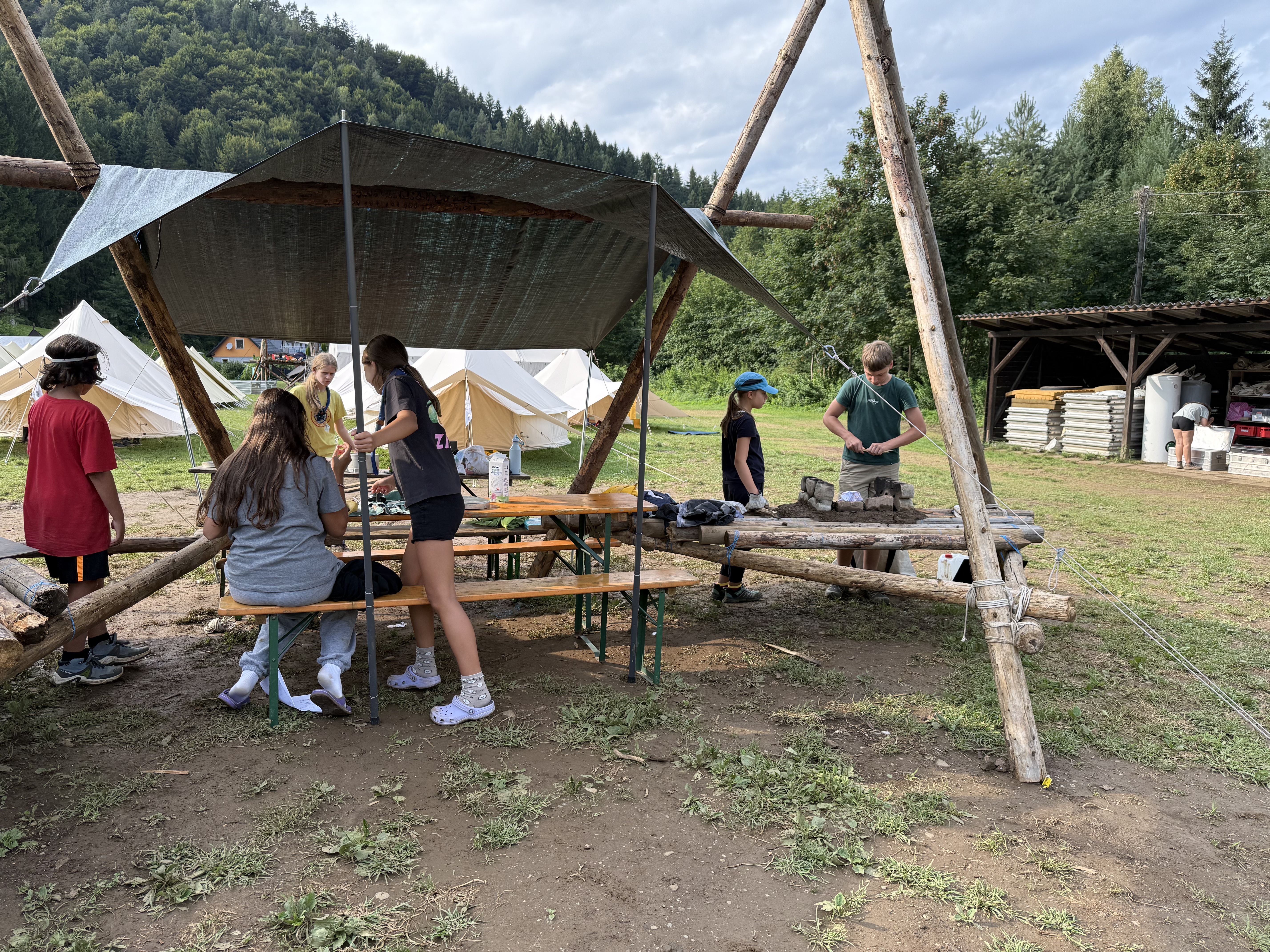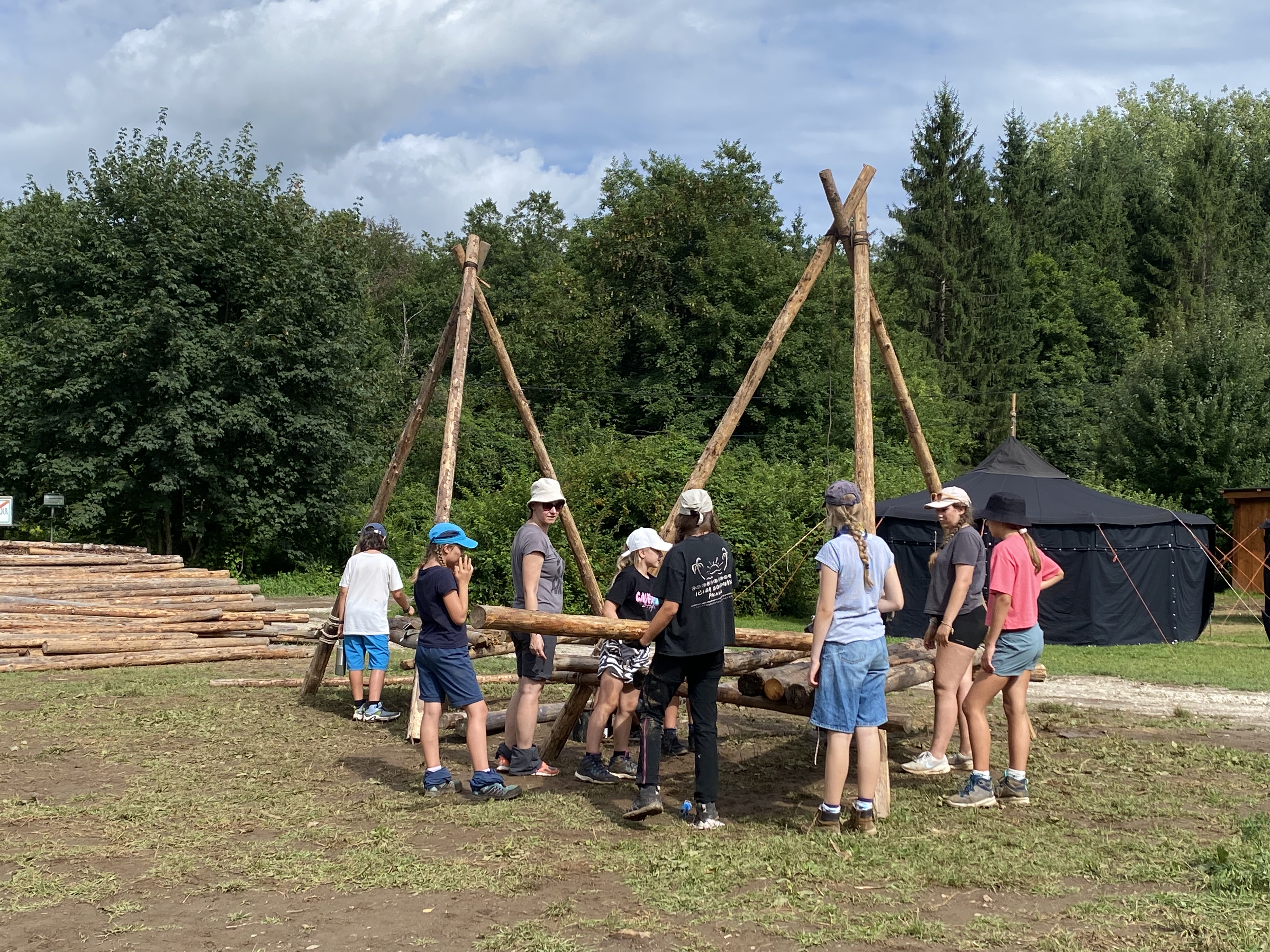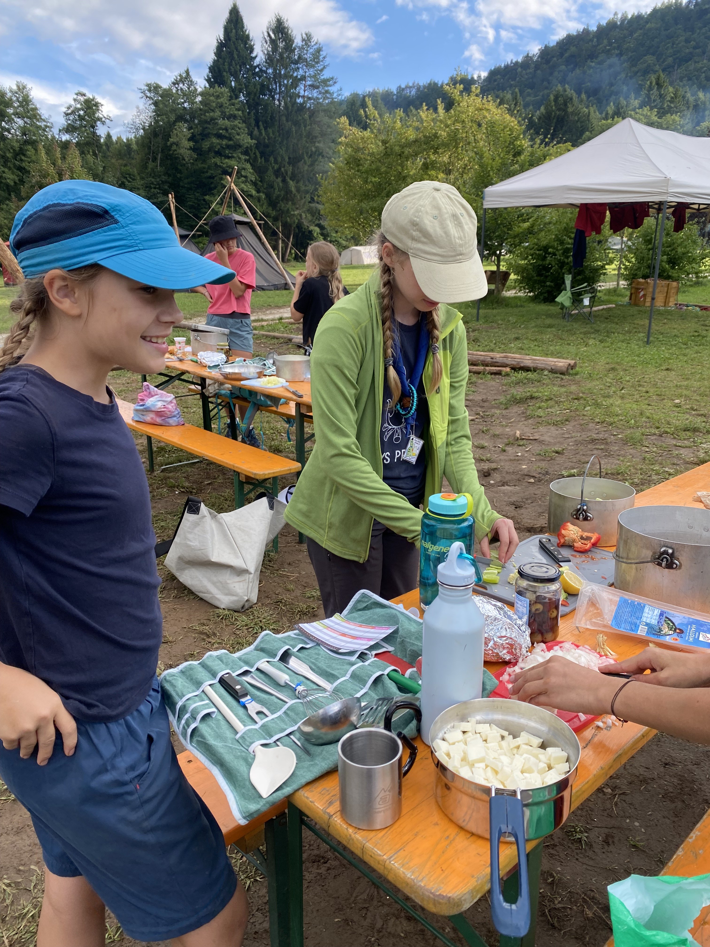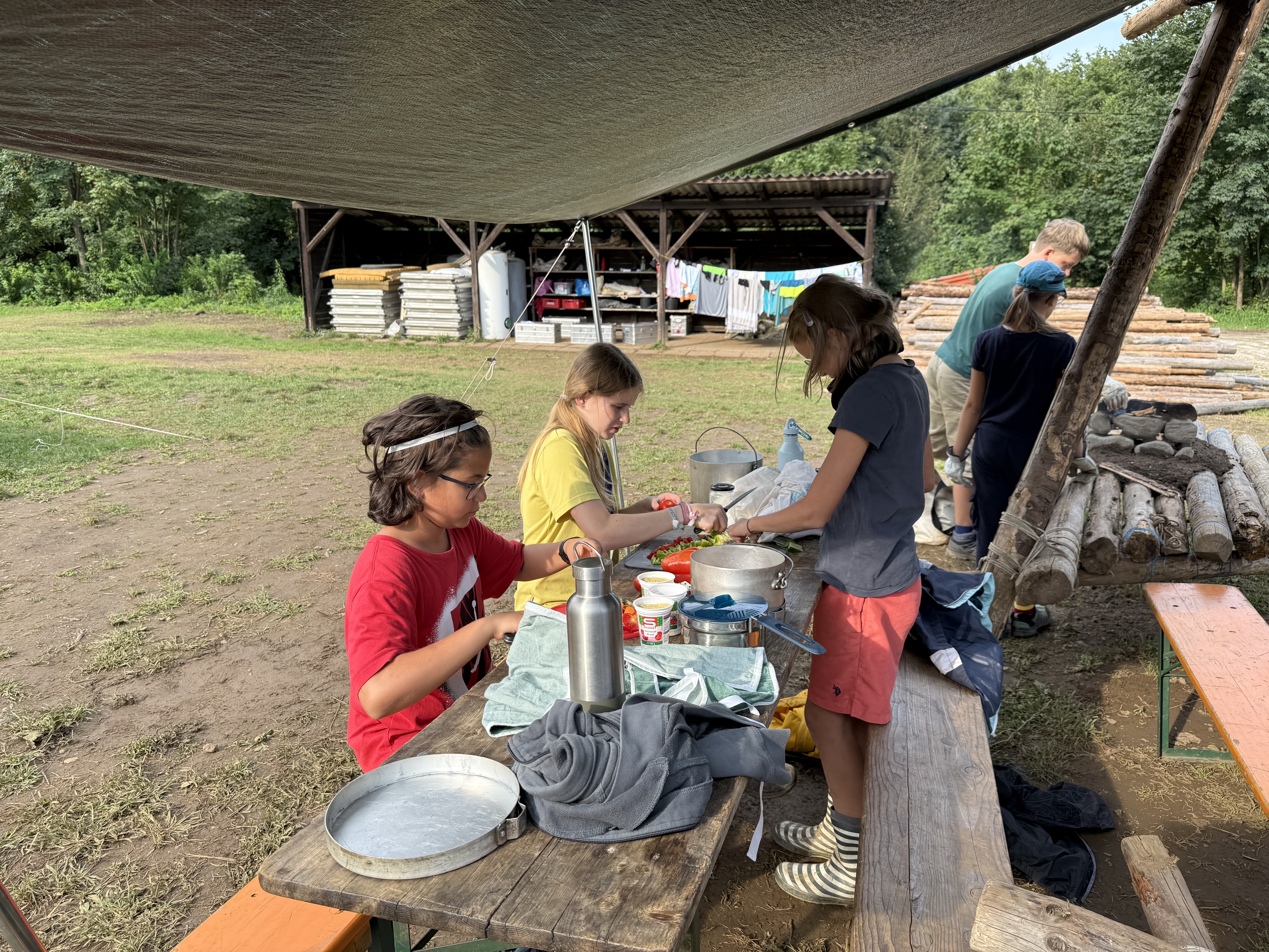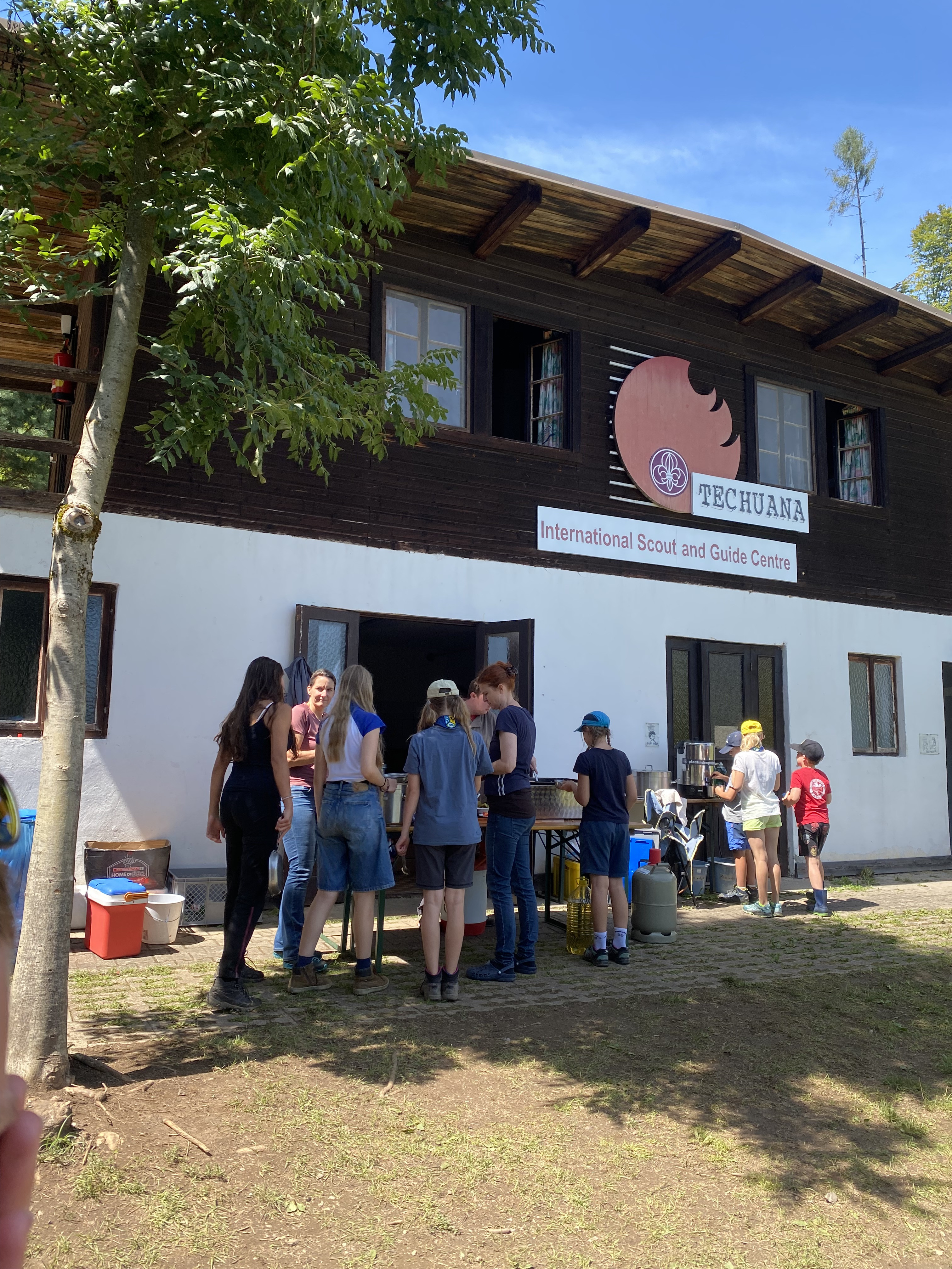 Tja, die Fotos von Montag sind leider erst heute Dienstag in Wien zum Hochladen angekommen – tut mir leid. Umso schöner sind die Bilder! Während die Guides und Späher ihre Doppel-Kochstelle fertiggestellt haben, haben die Caravelles und Explorer sich im Spiel Taskmaster versucht – leider (oder zum Glück?) ohne Beisein des britischen Fernsehens. Ich hoffe, euch die detaillierten Aufgabenbeschreibungen der CaEx nachreichen zu können.