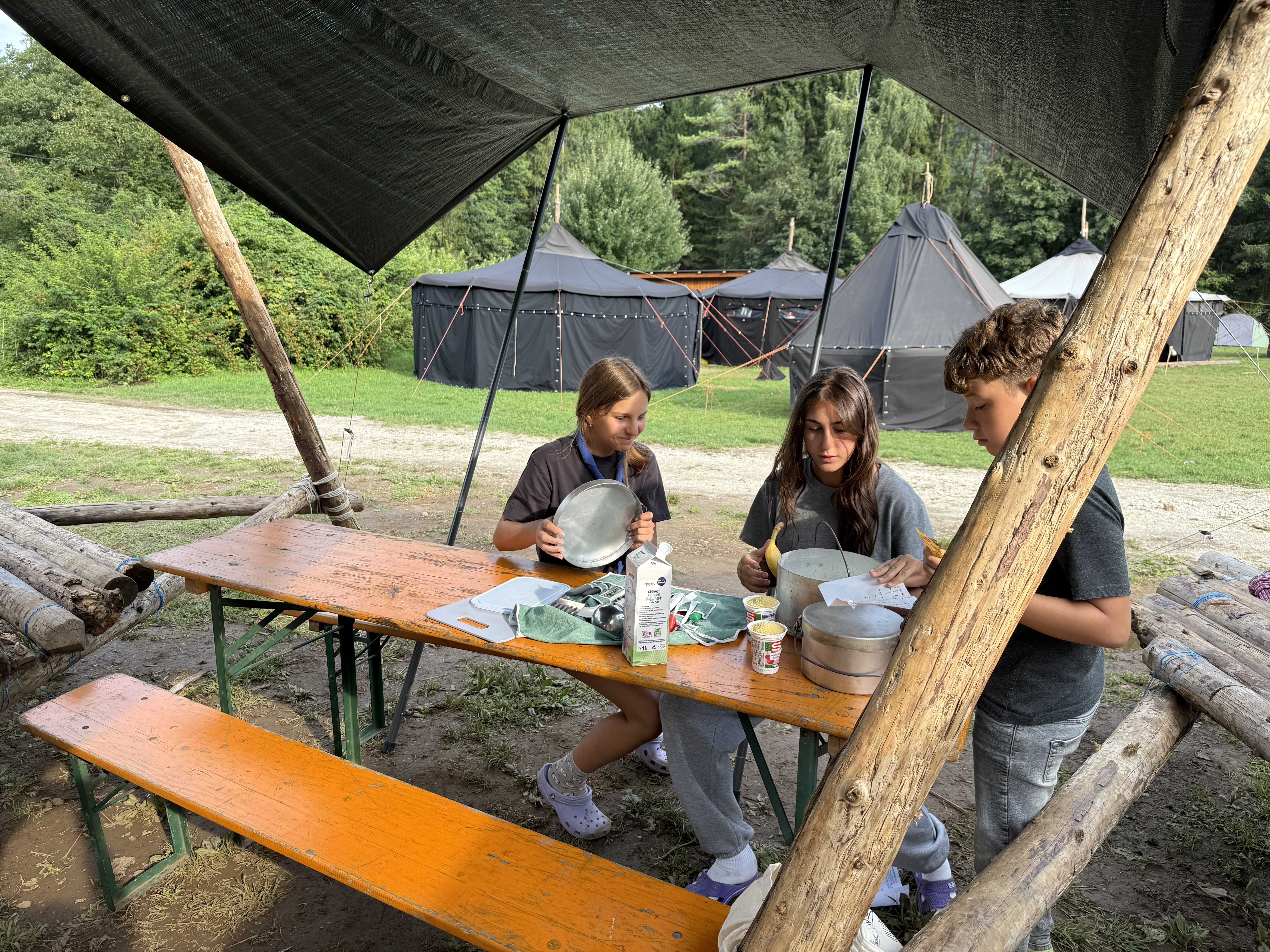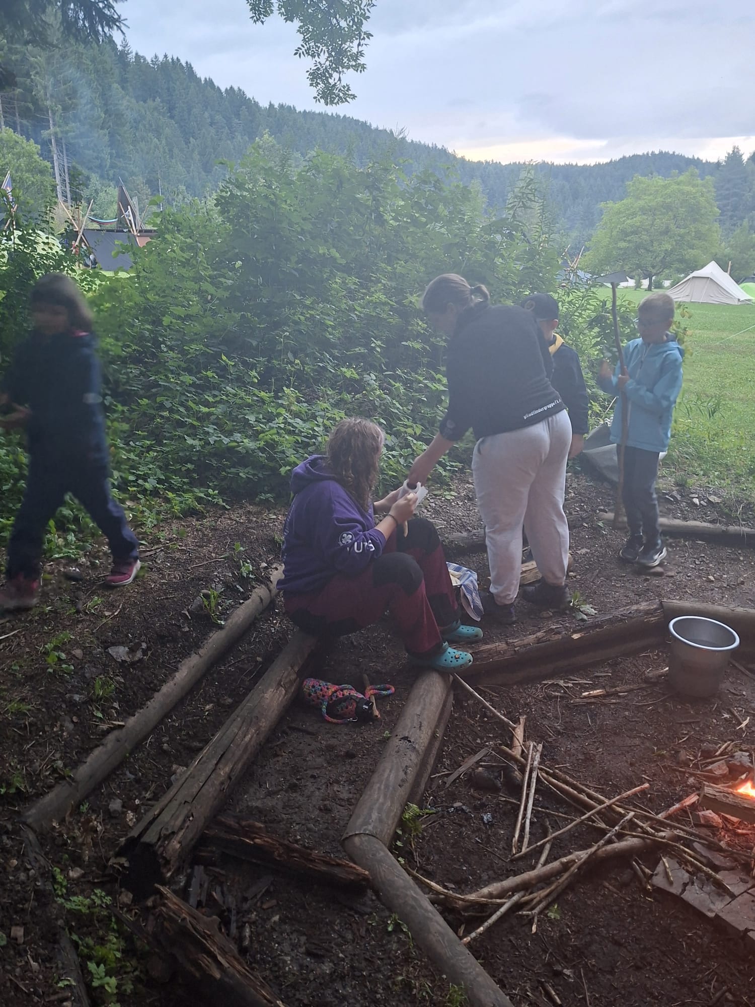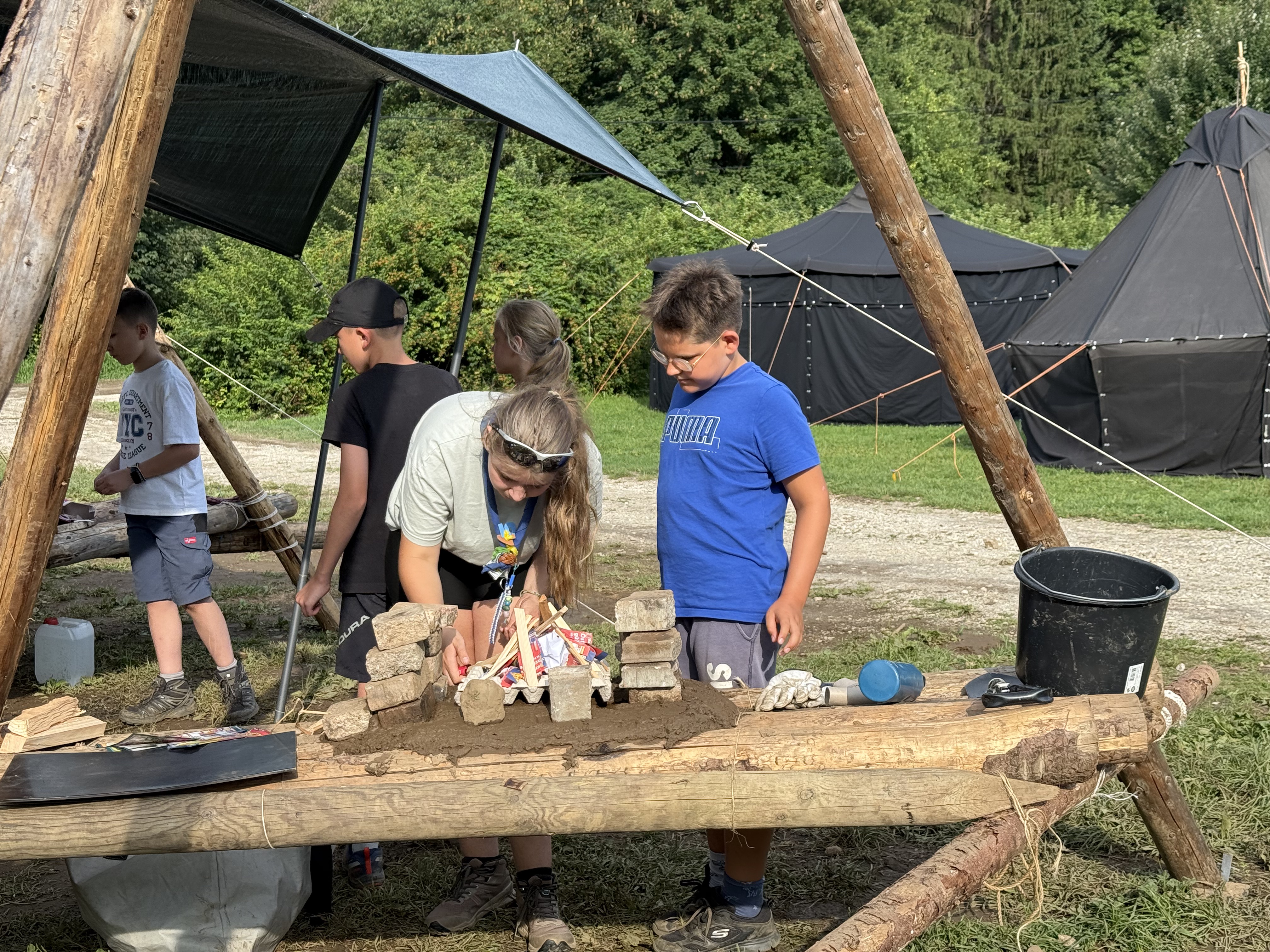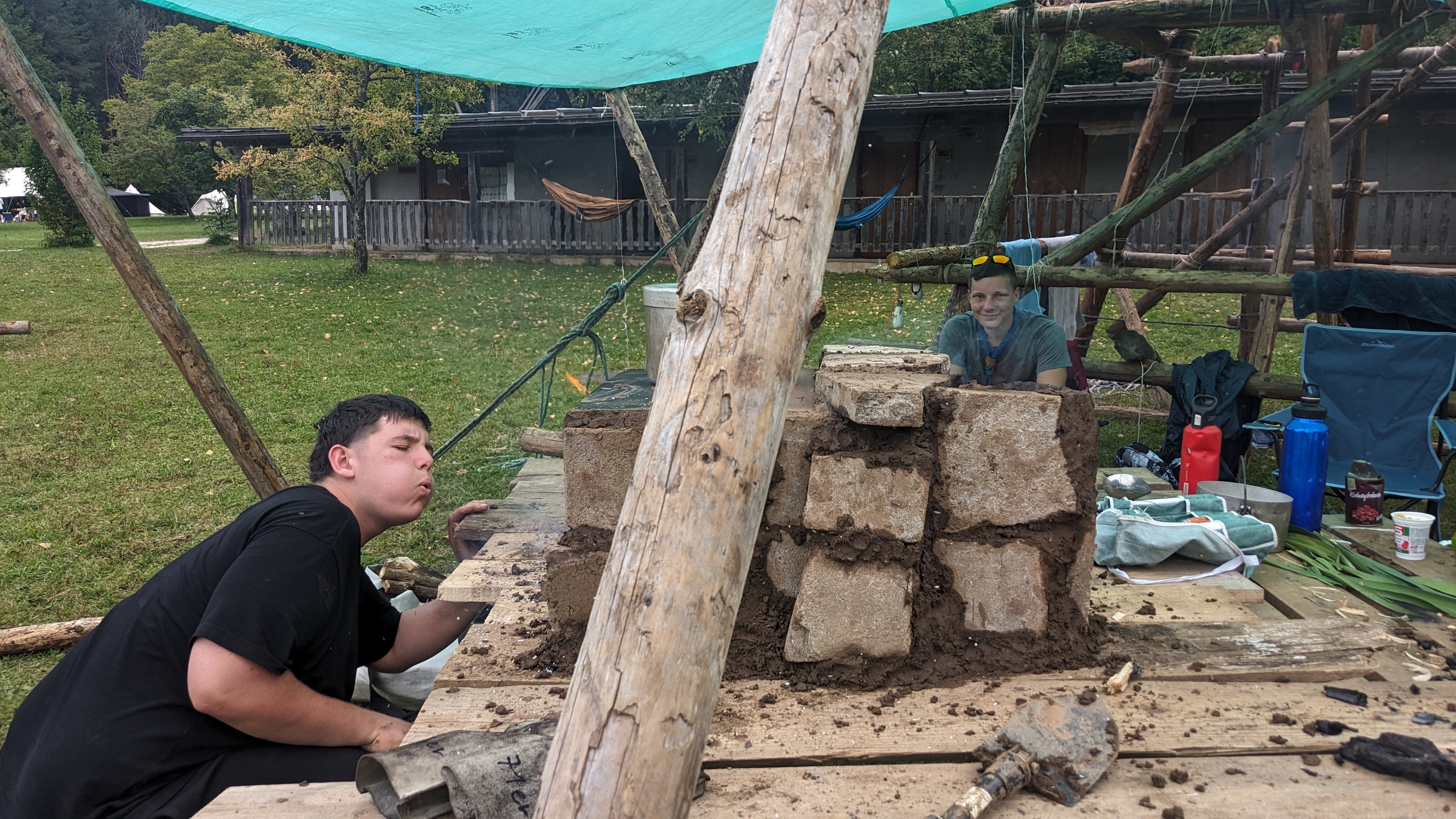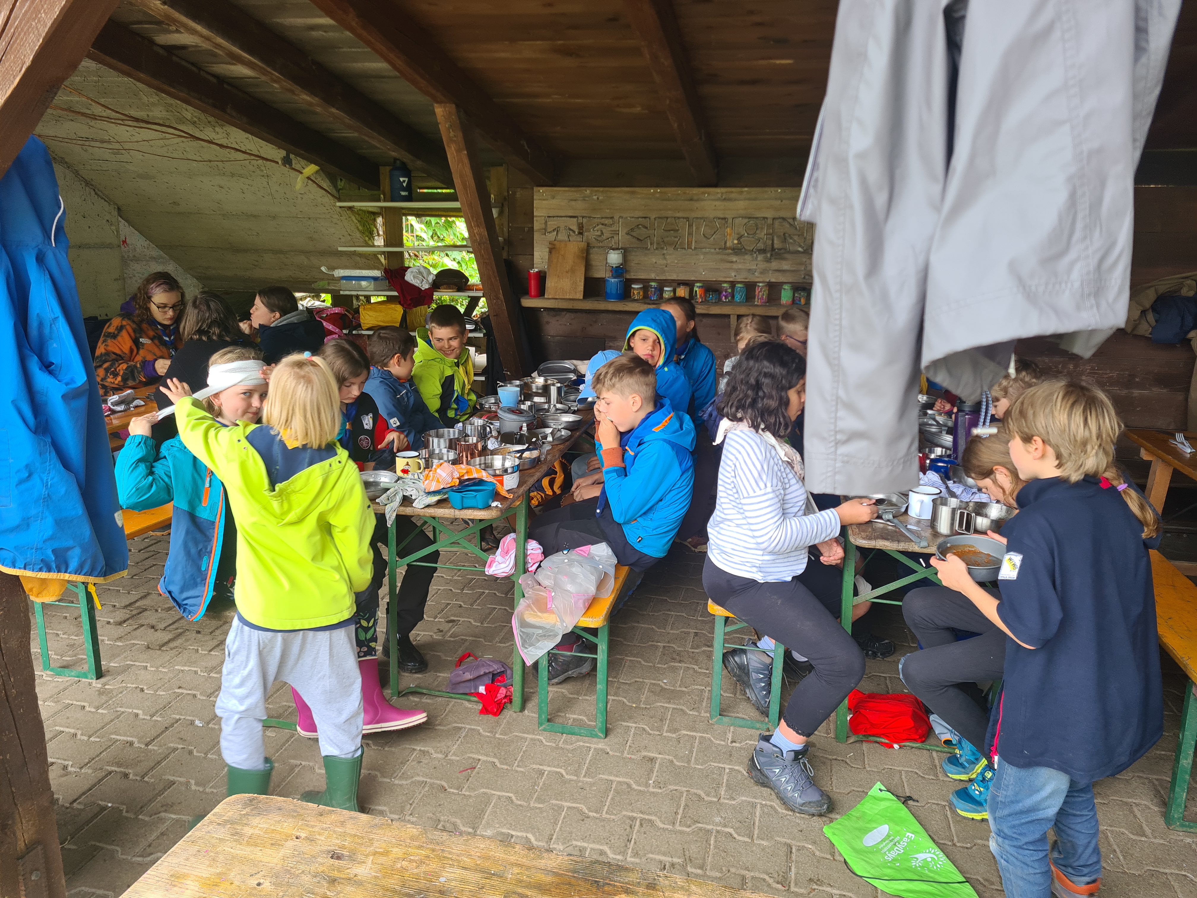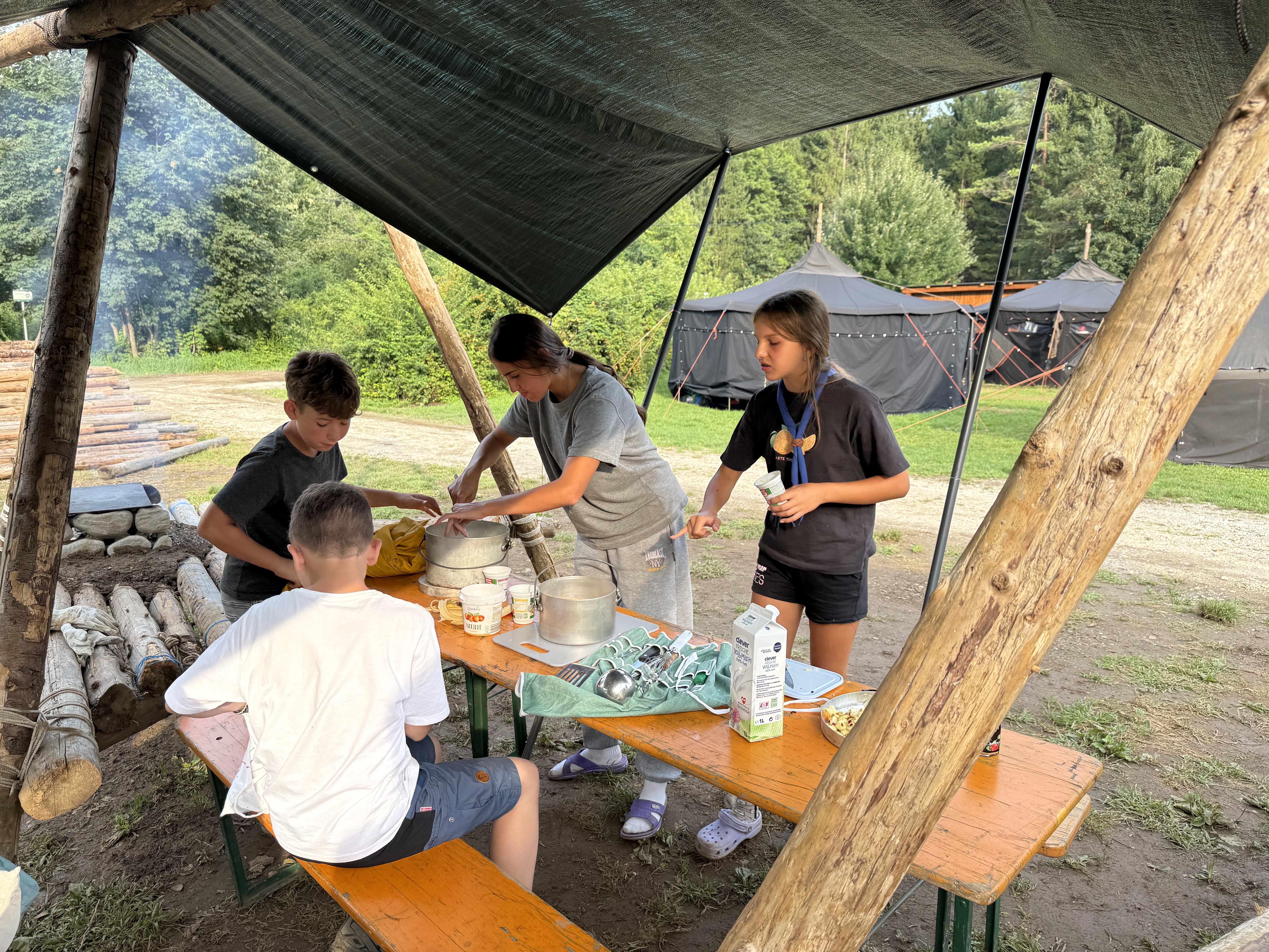 Tja, die Fotos von Montag sind leider erst heute Dienstag in Wien zum Hochladen angekommen – tut mir leid. Umso schöner sind die Bilder! Während die Guides und Späher ihre Doppel-Kochstelle fertiggestellt haben, haben die Caravelles und Explorer sich im Spiel Taskmaster versucht – leider (oder zum Glück?) ohne Beisein des britischen Fernsehens. Ich hoffe, euch die detaillierten Aufgabenbeschreibungen der CaEx nachreichen zu können.