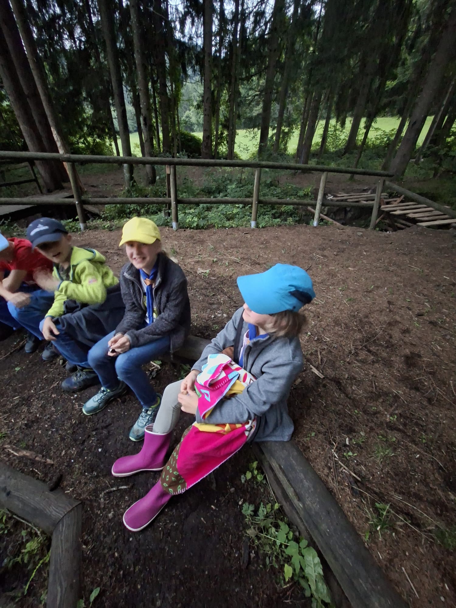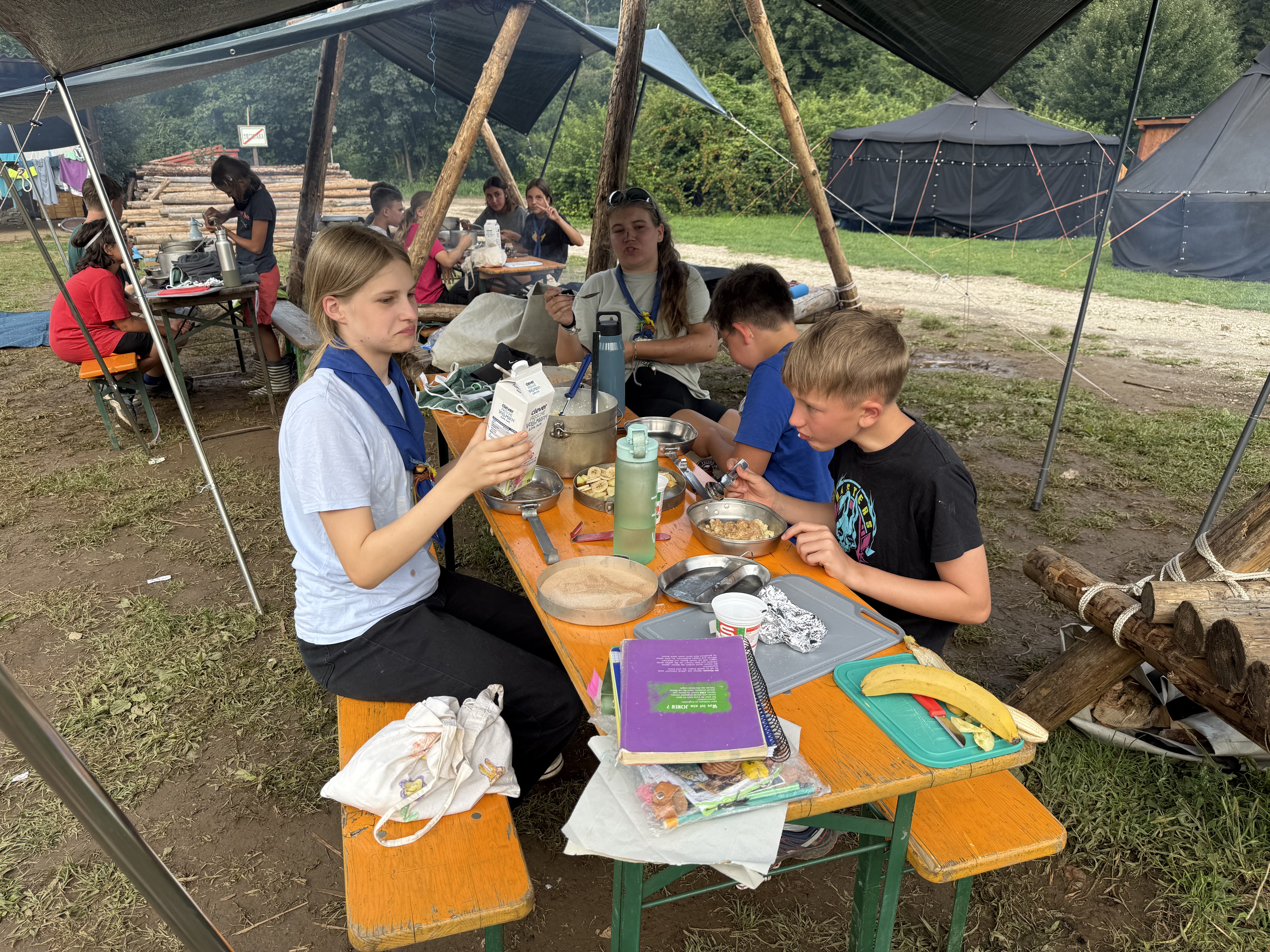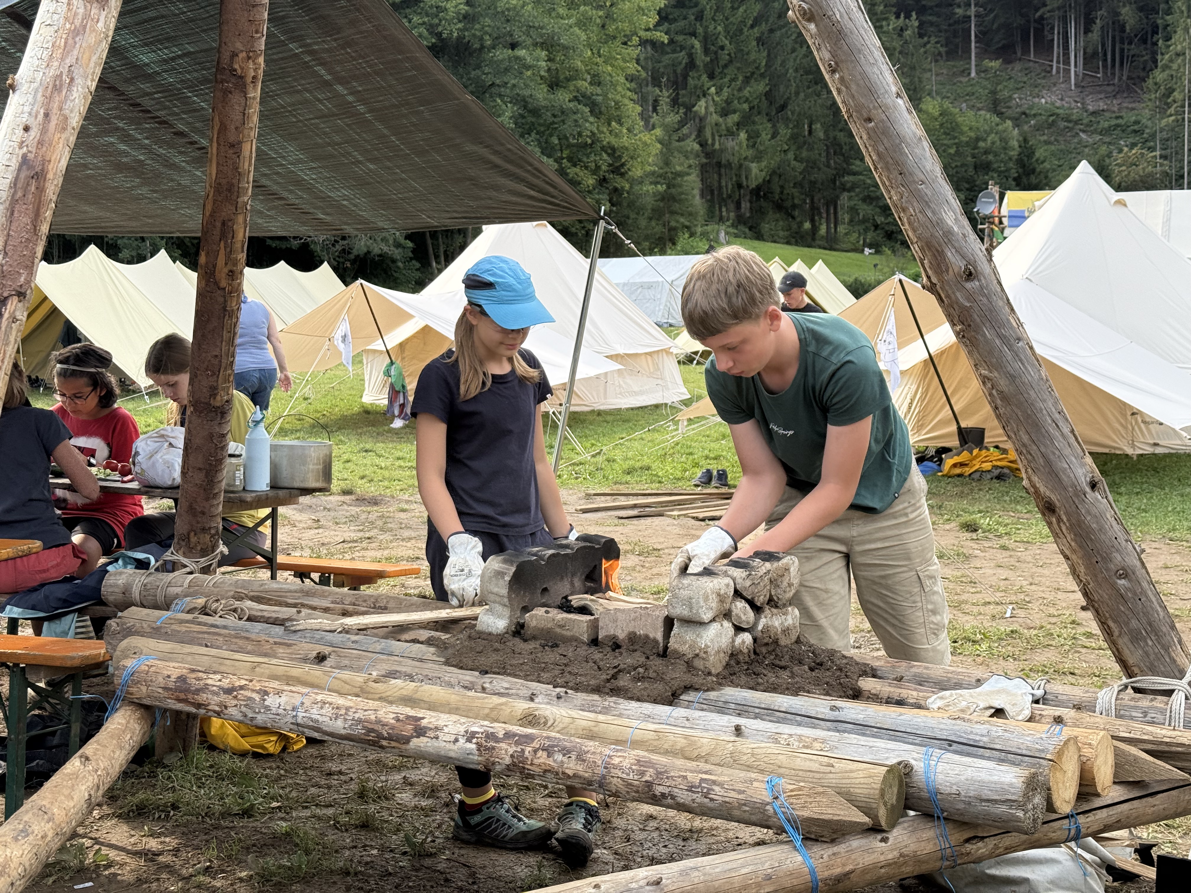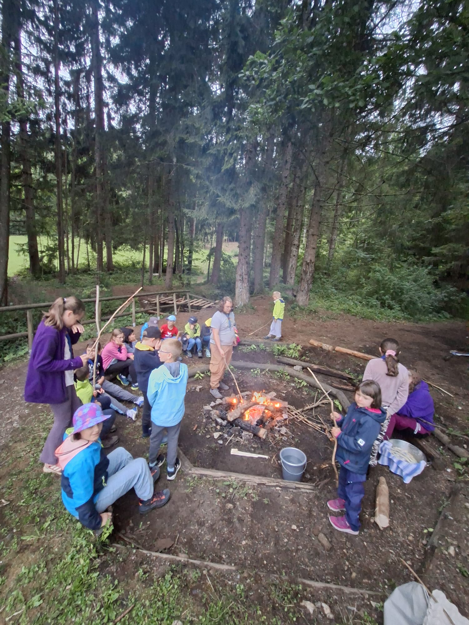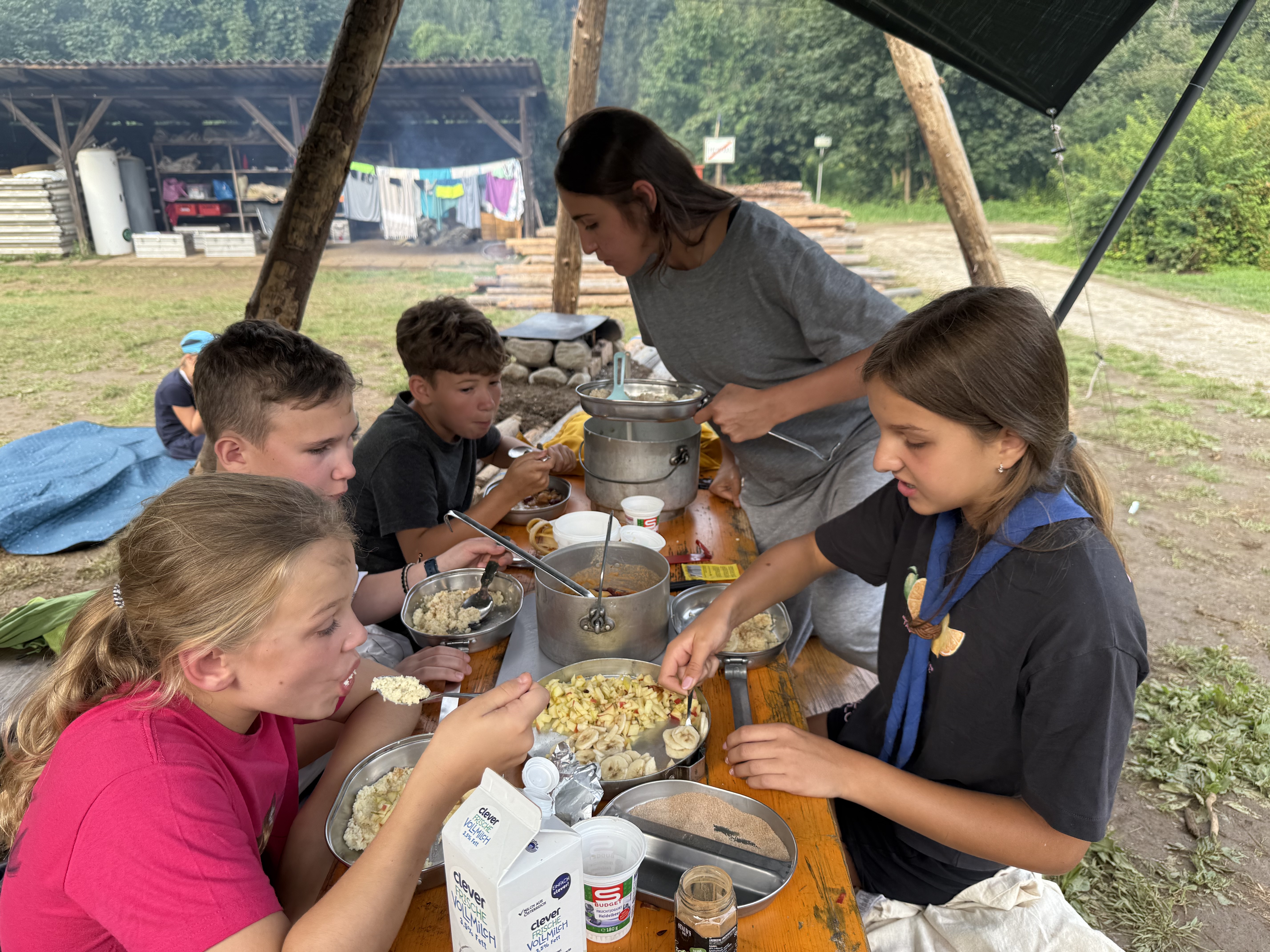 Tja, die Fotos von Montag sind leider erst heute Dienstag in Wien zum Hochladen angekommen – tut mir leid. Umso schöner sind die Bilder! Während die Guides und Späher ihre Doppel-Kochstelle fertiggestellt haben, haben die Caravelles und Explorer sich im Spiel Taskmaster versucht – leider (oder zum Glück?) ohne Beisein des britischen Fernsehens. Ich hoffe, euch die detaillierten Aufgabenbeschreibungen der CaEx nachreichen zu können.