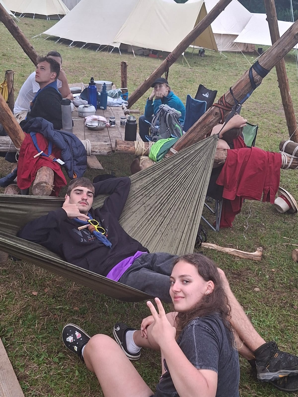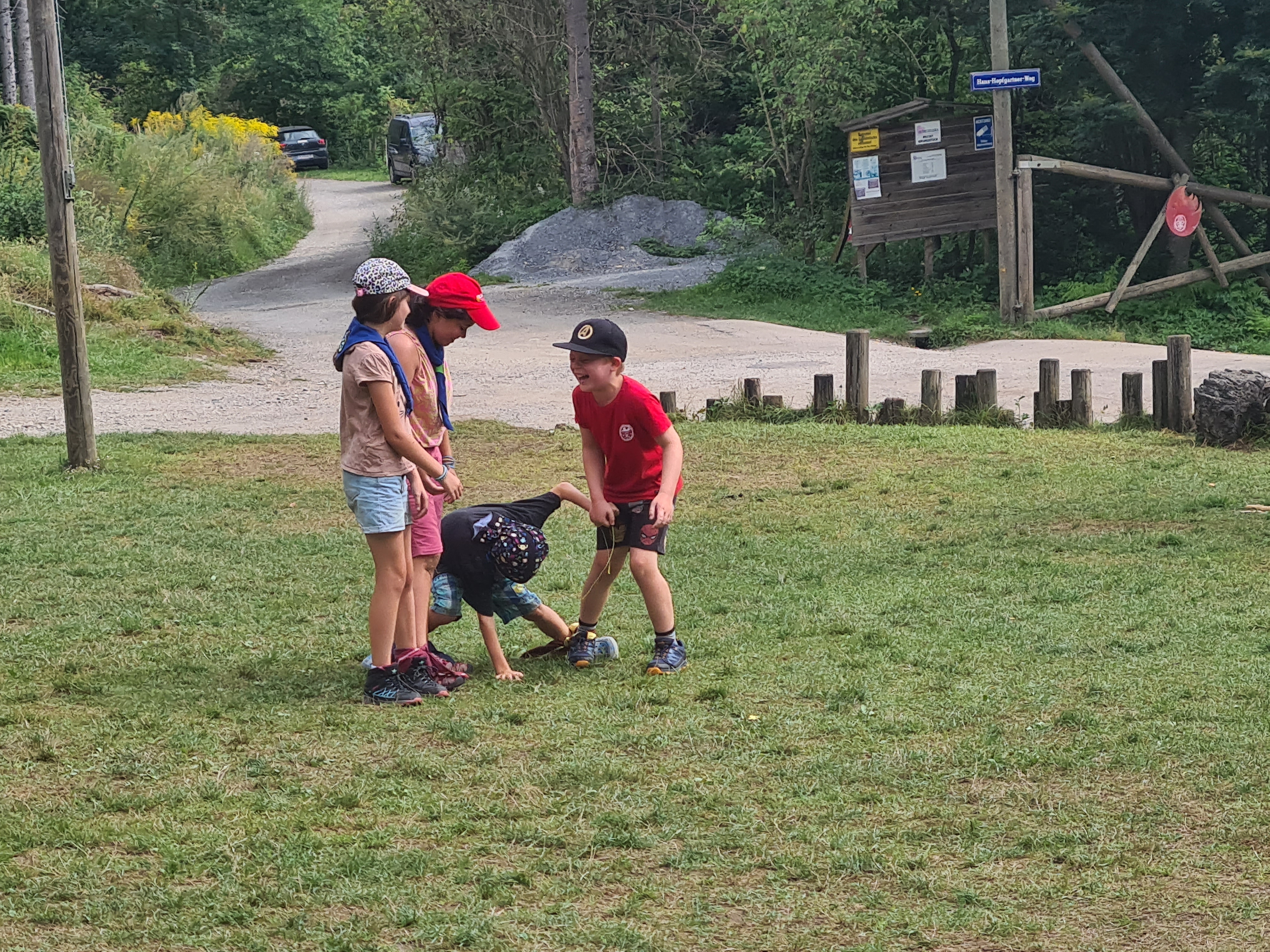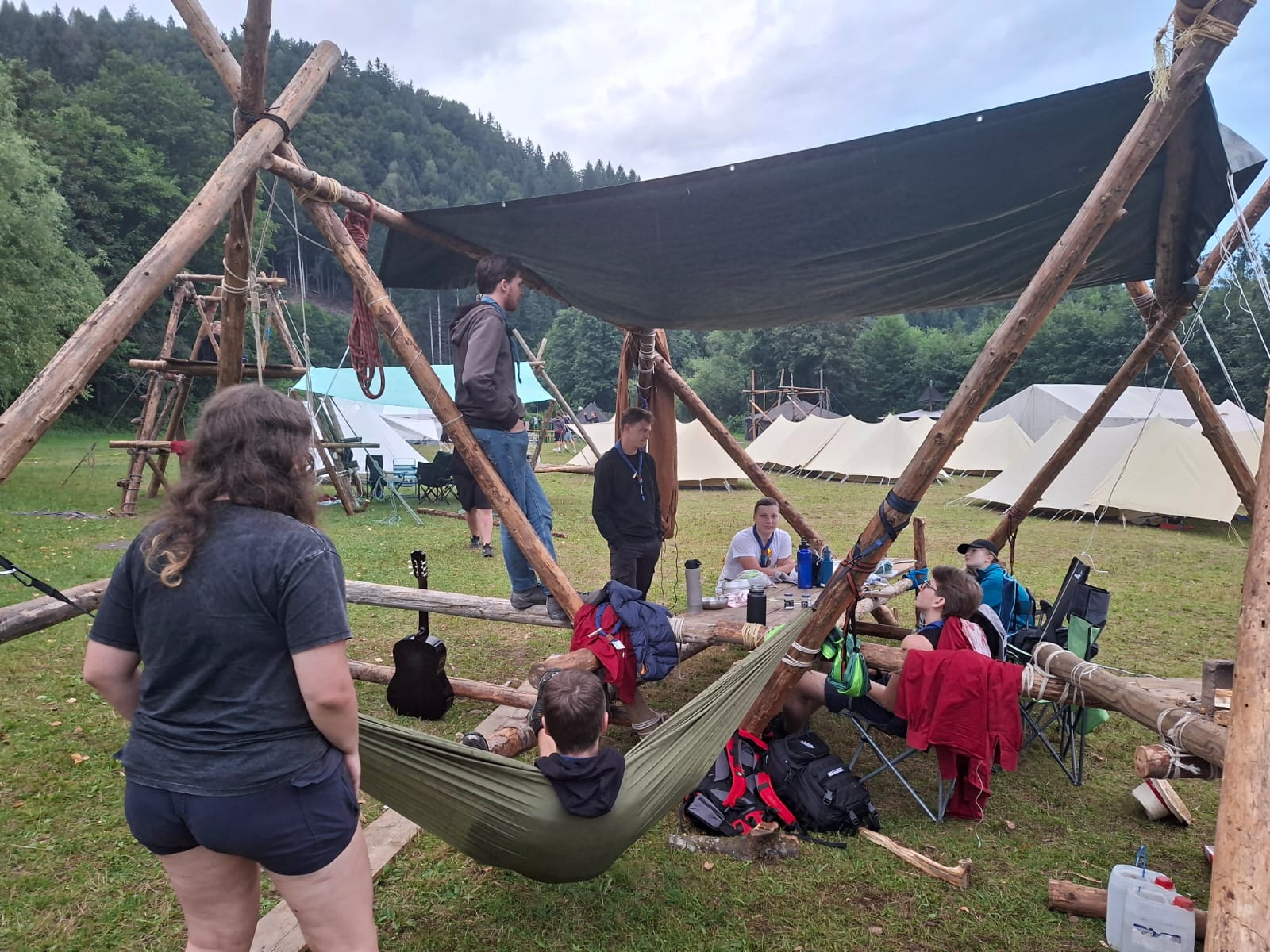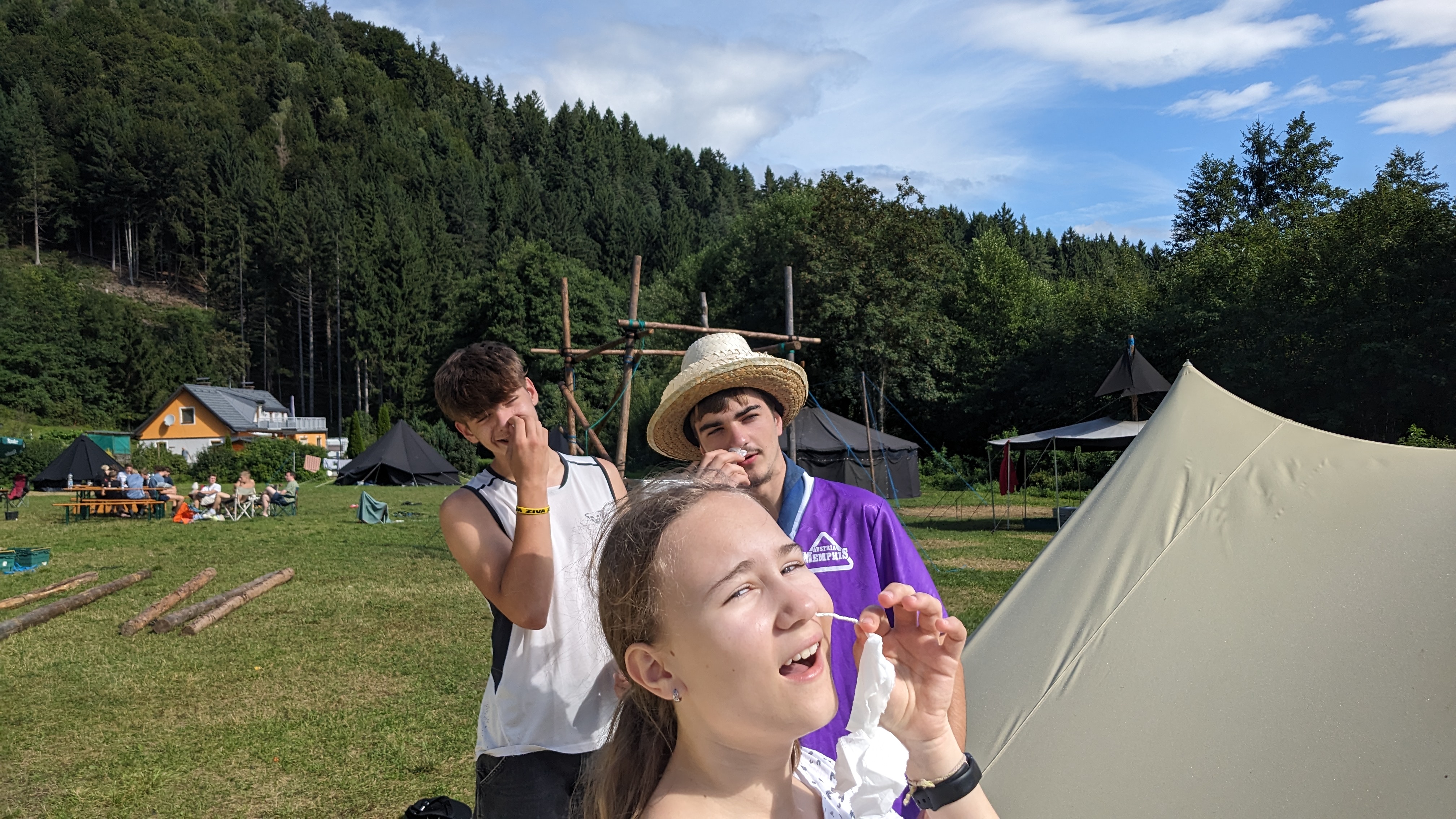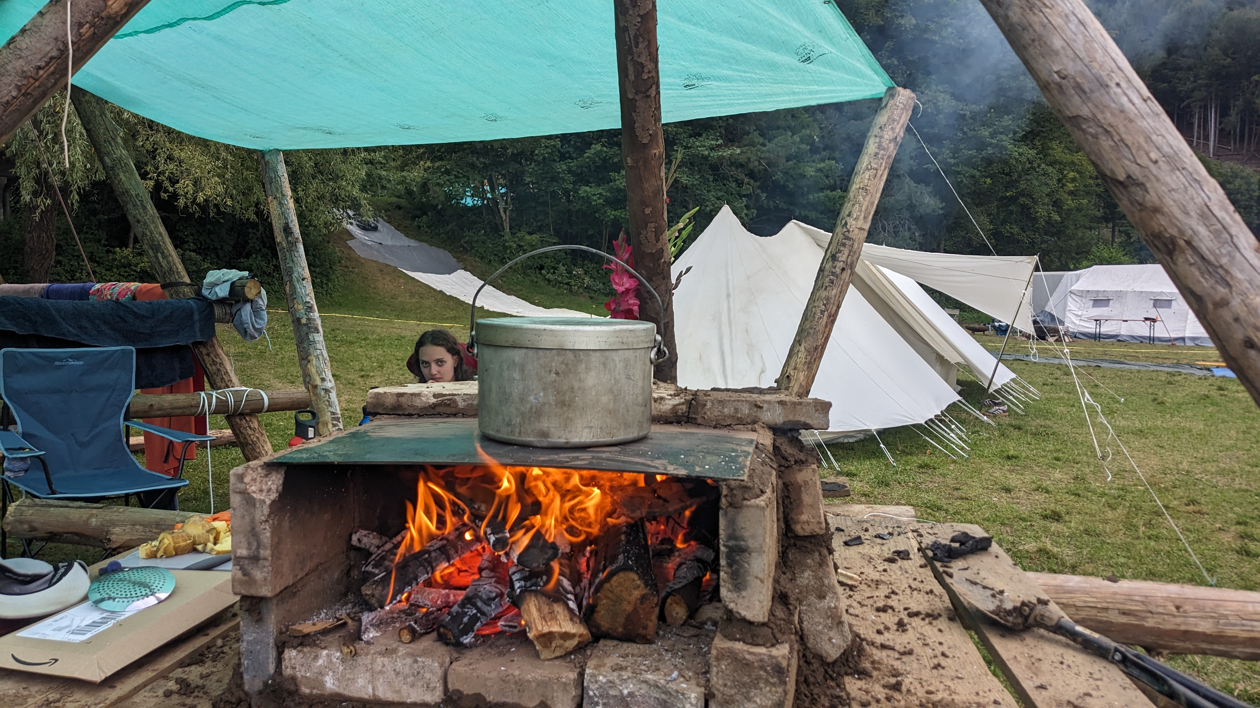 Tja, die Fotos von Montag sind leider erst heute Dienstag in Wien zum Hochladen angekommen – tut mir leid. Umso schöner sind die Bilder! Während die Guides und Späher ihre Doppel-Kochstelle fertiggestellt haben, haben die Caravelles und Explorer sich im Spiel Taskmaster versucht – leider (oder zum Glück?) ohne Beisein des britischen Fernsehens. Ich hoffe, euch die detaillierten Aufgabenbeschreibungen der CaEx nachreichen zu können.